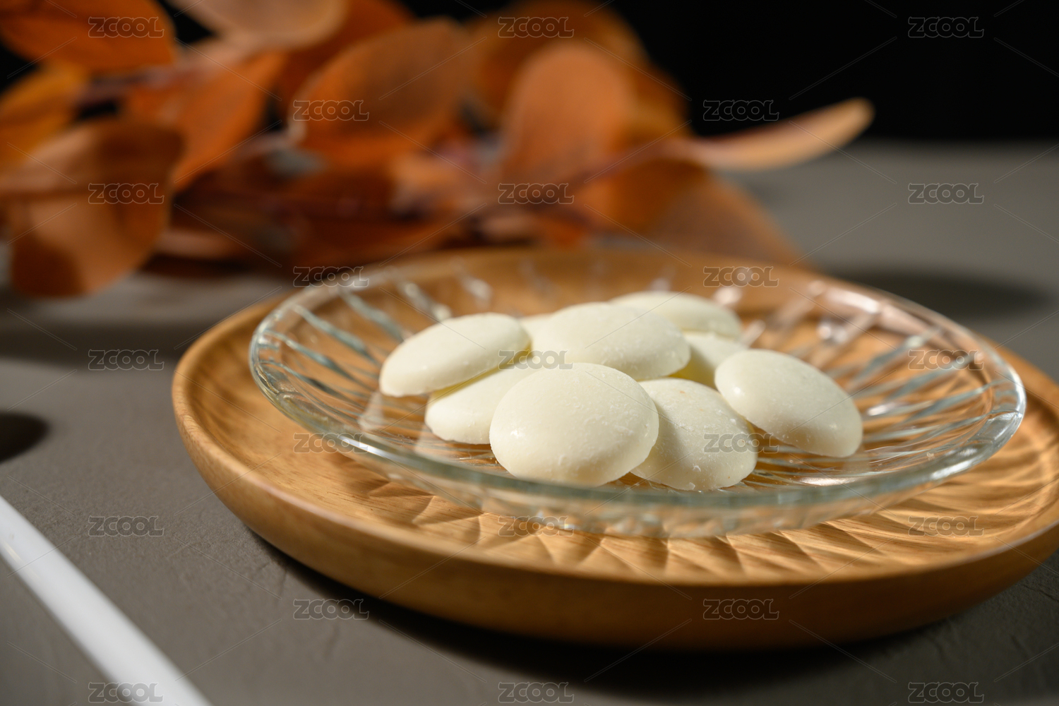 桌面上的盘子里的美味可口的白巧克力币