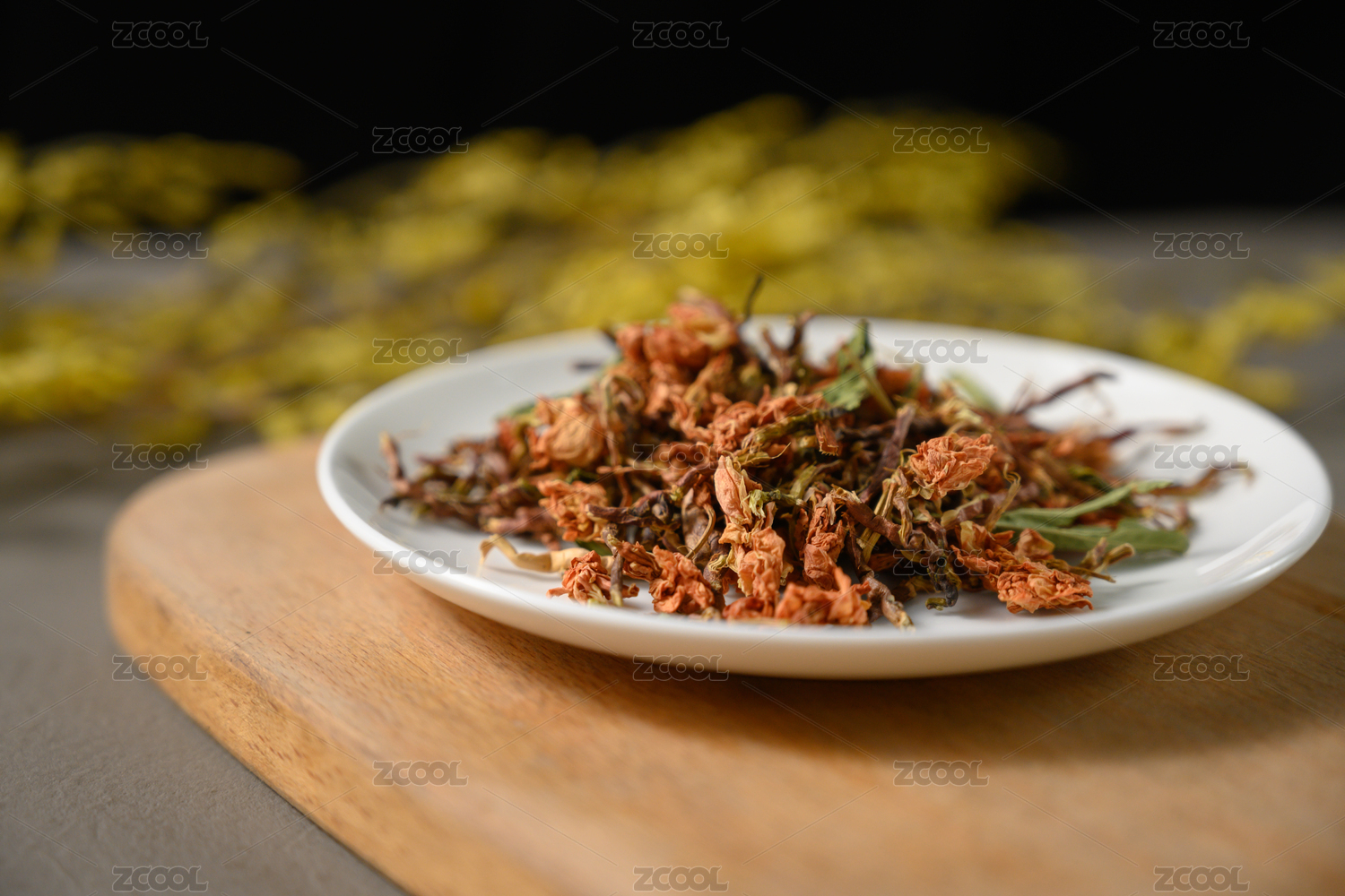 桌面上的盘子里的干爽的山蜜茶