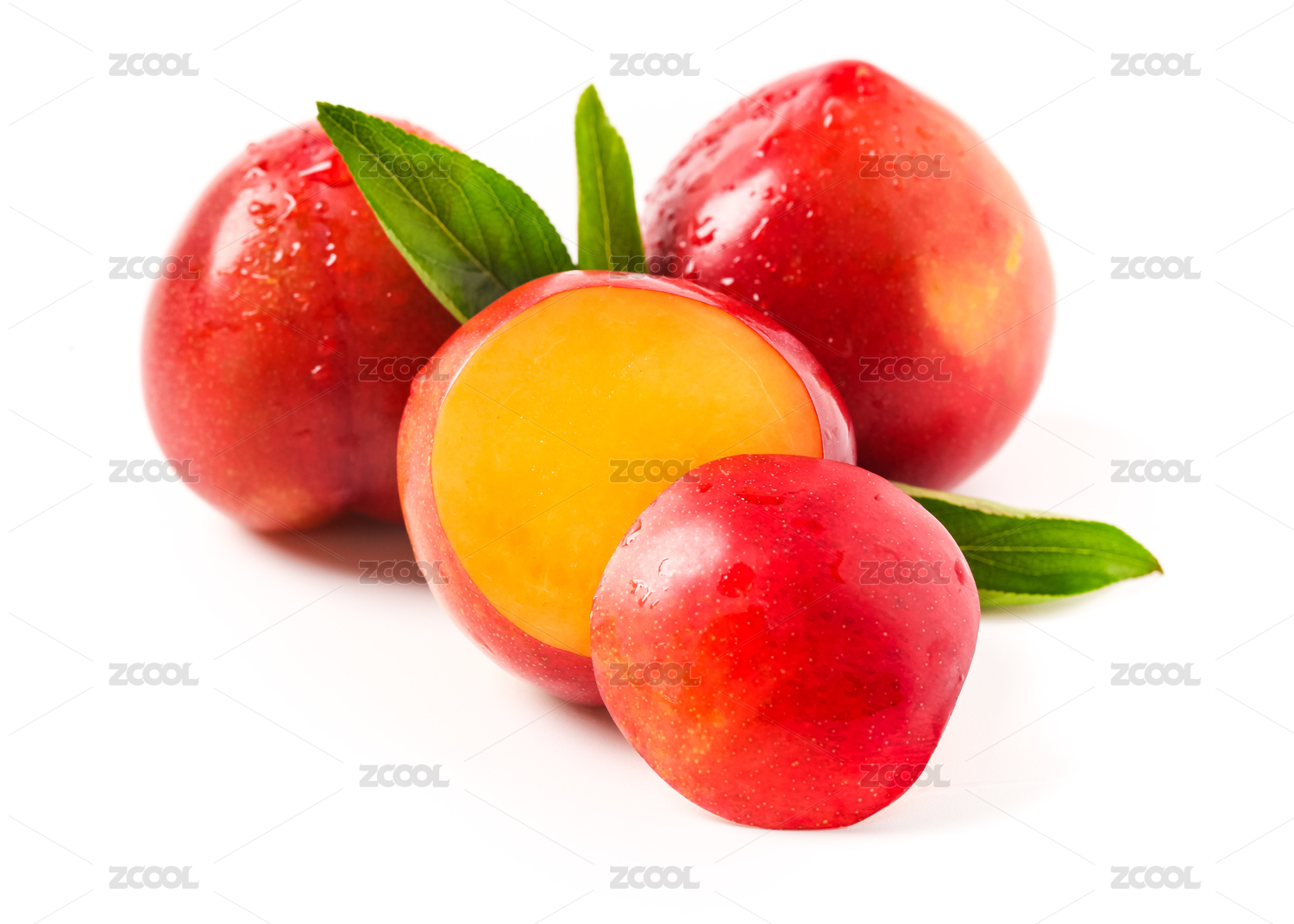 白底上三个李子和一个切开的李子旁靠着一个李子果瓣