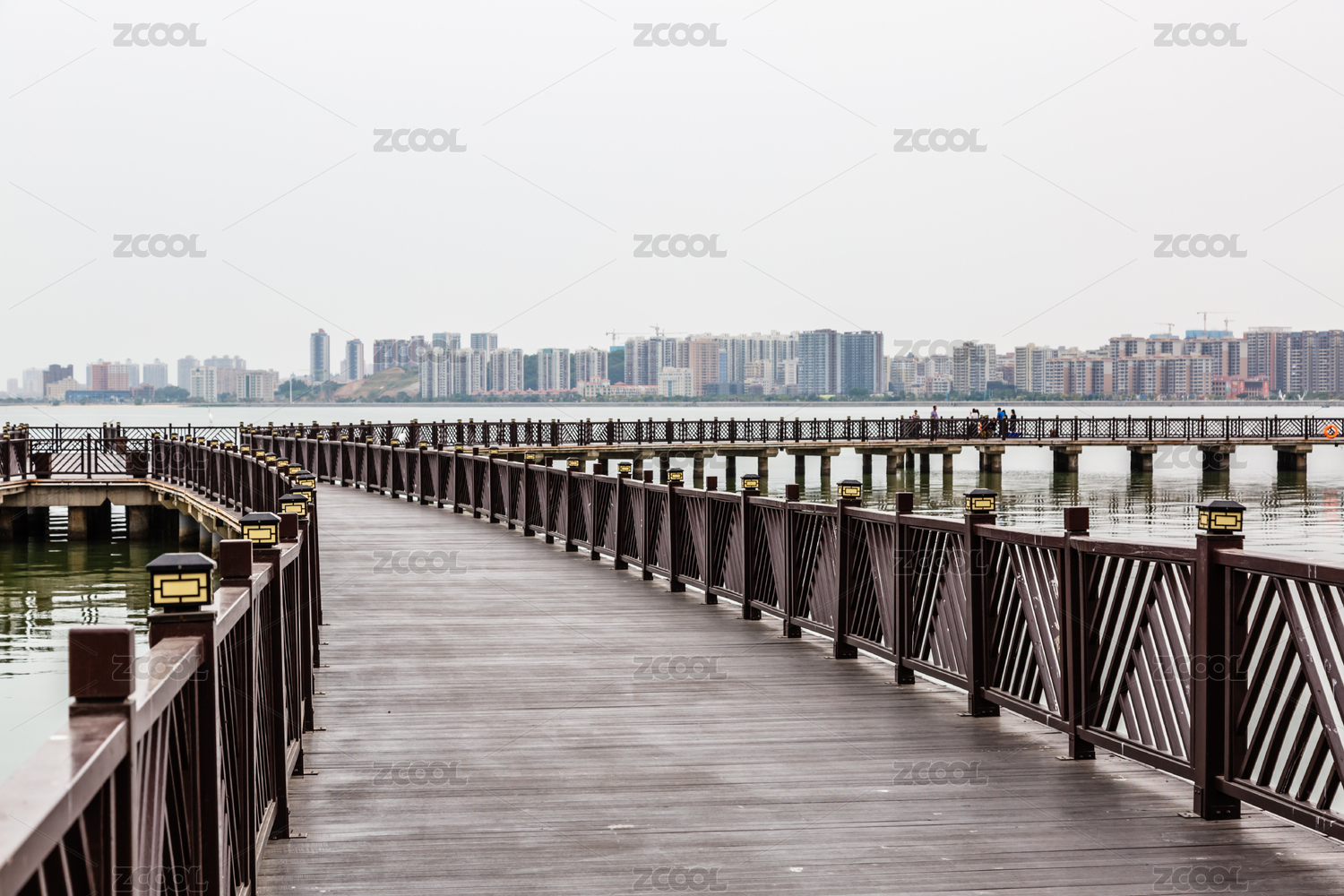 江苏省无锡市蠡湖的木栈道上远太湖新城