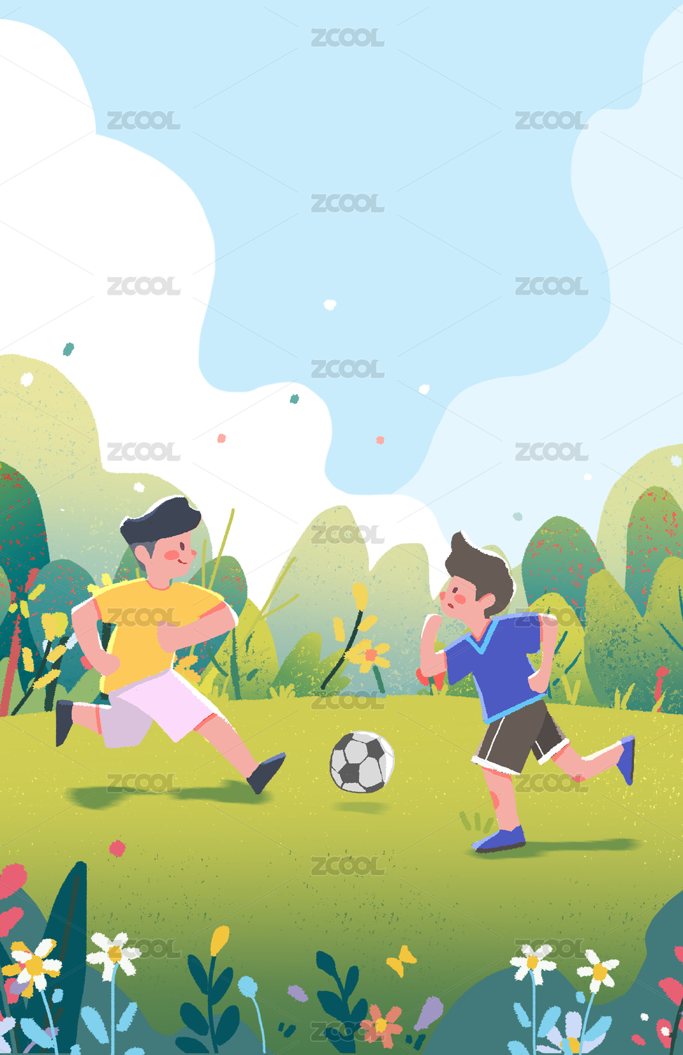 亲子踢足球矢量插画