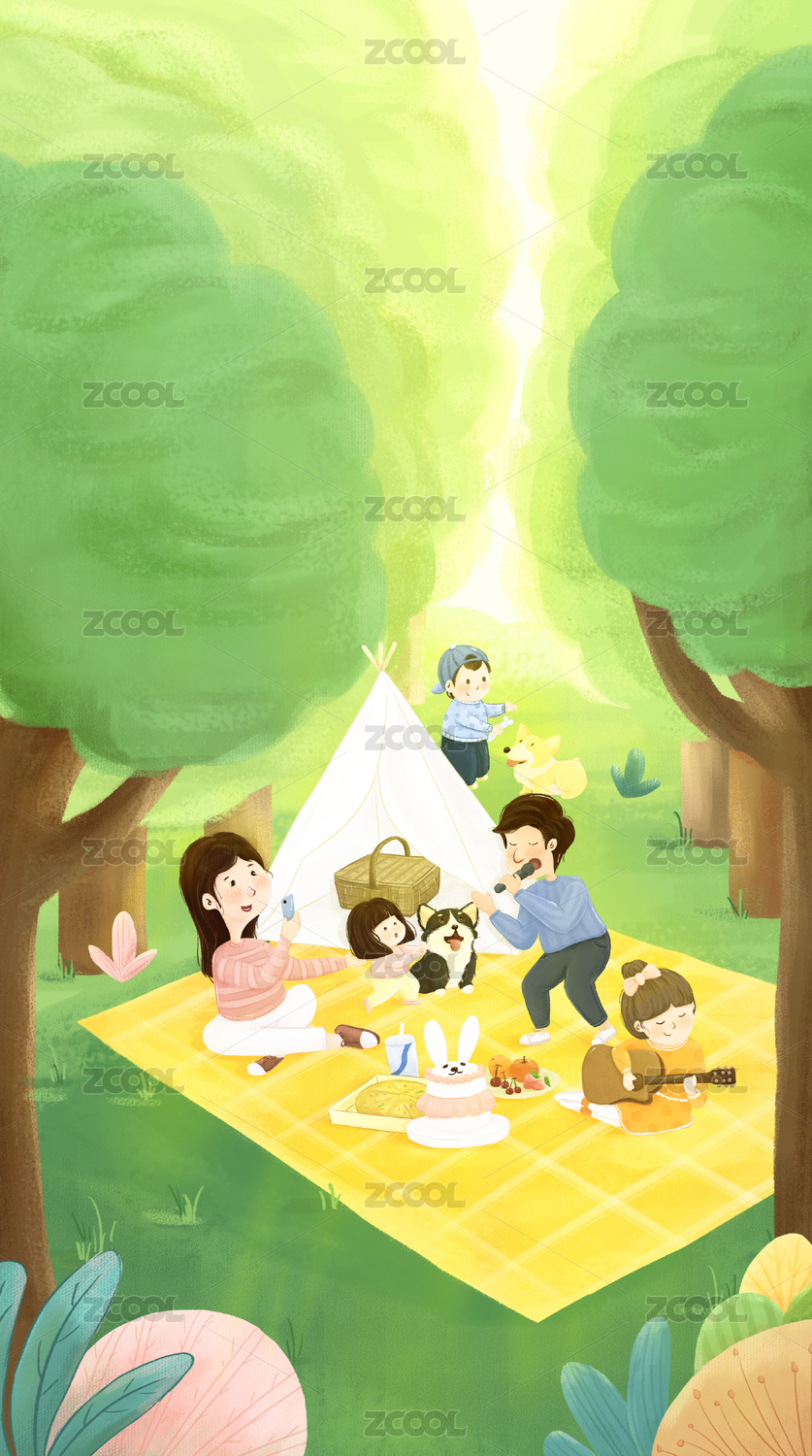 三胎家庭公园野餐儿童插画
