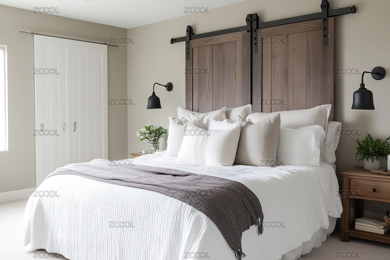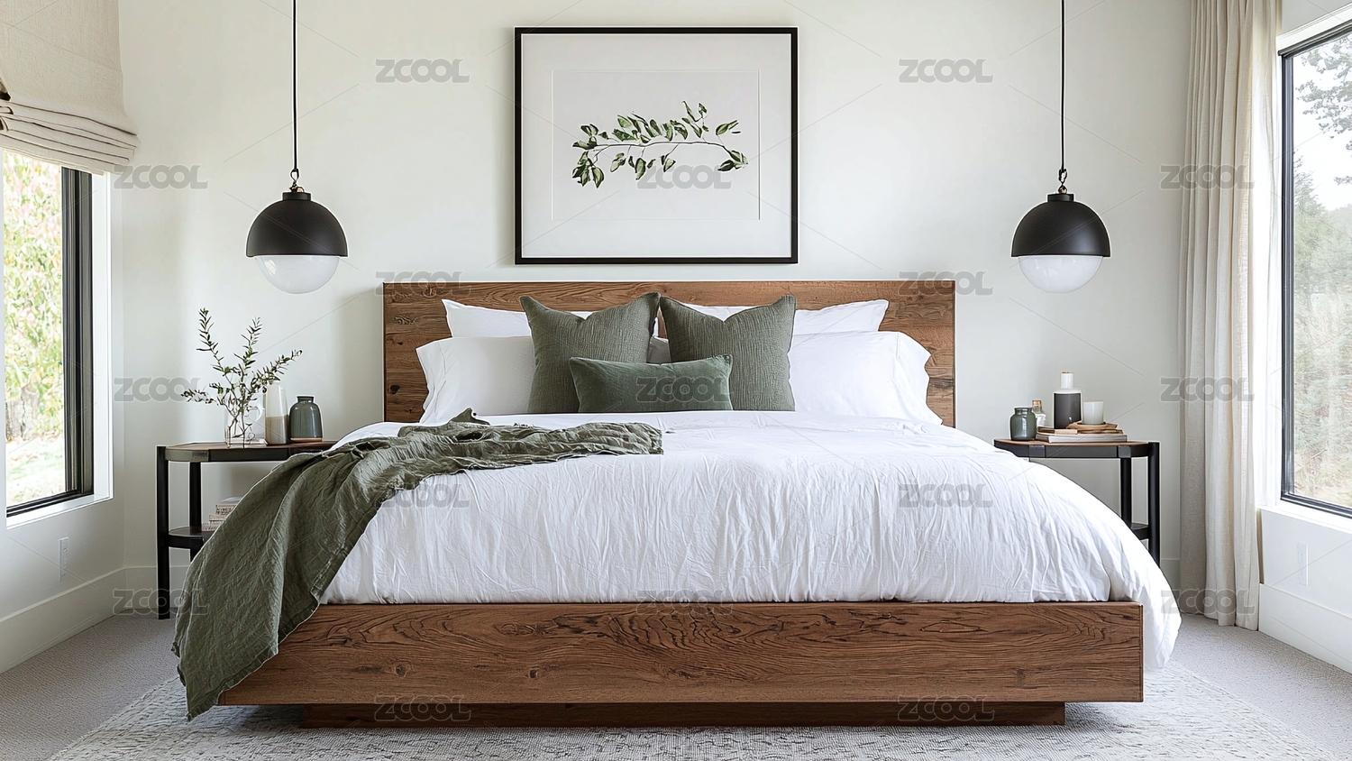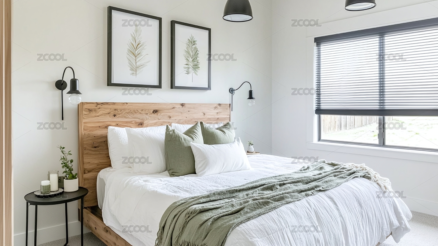 卧室,白色墙面,鼠尾草绿,罗马帘,黑色吊灯,床头柜,墙画,装饰蜡烛,绿植,地毯