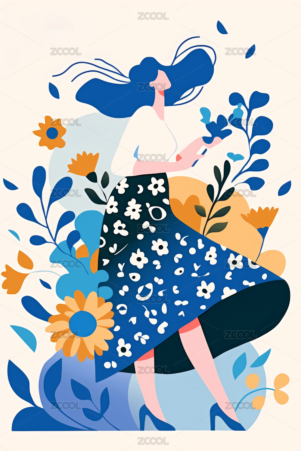 扁平风女孩与植物插画