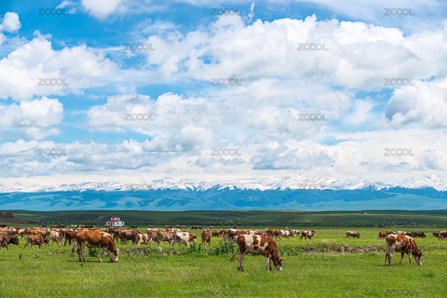 中国新疆伊犁那拉提草原高山草甸牛自然风光