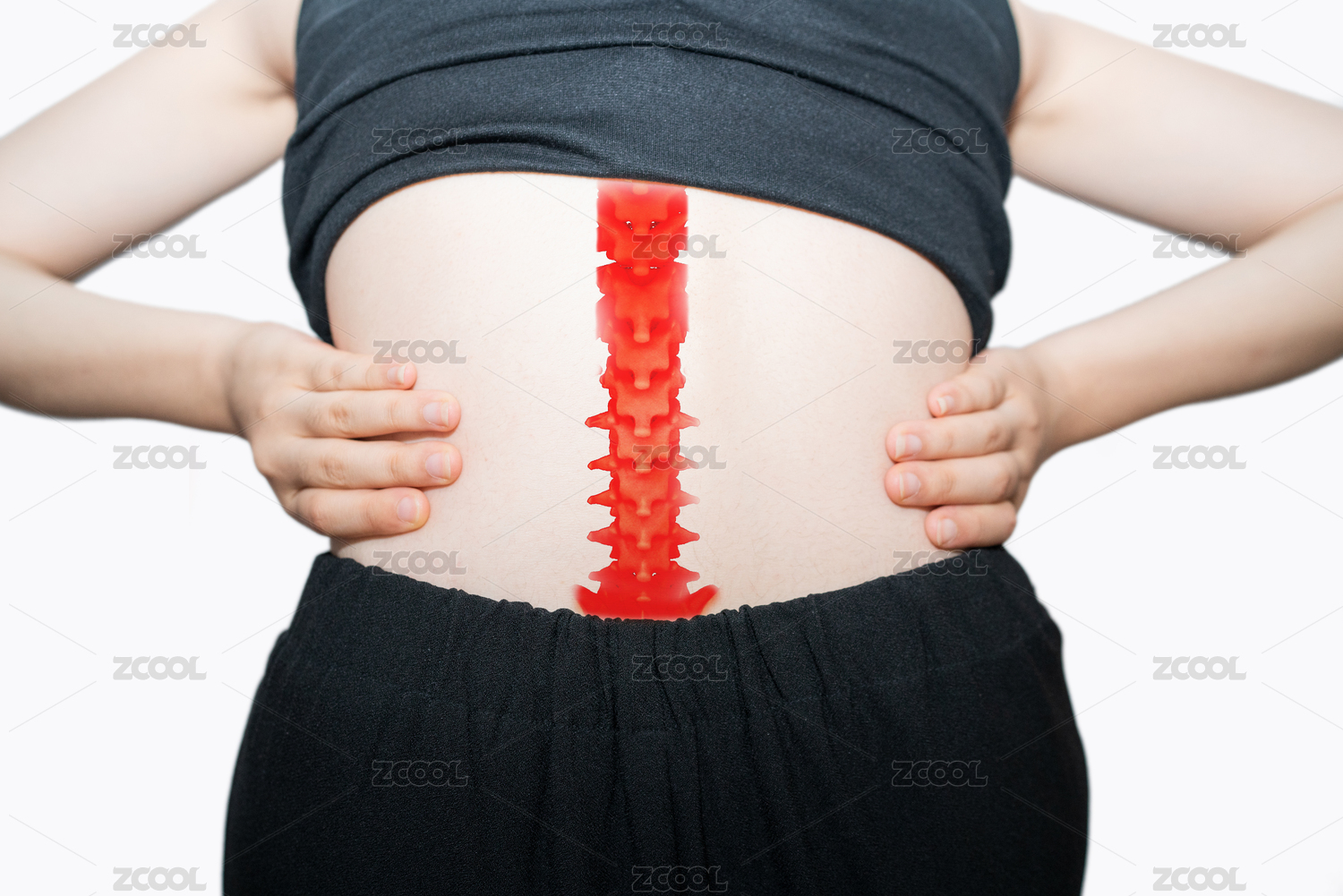 一个女人白色背景棚拍抚摸叉腰感觉脊柱后腰疼痛酸疼发炎红肿概念
