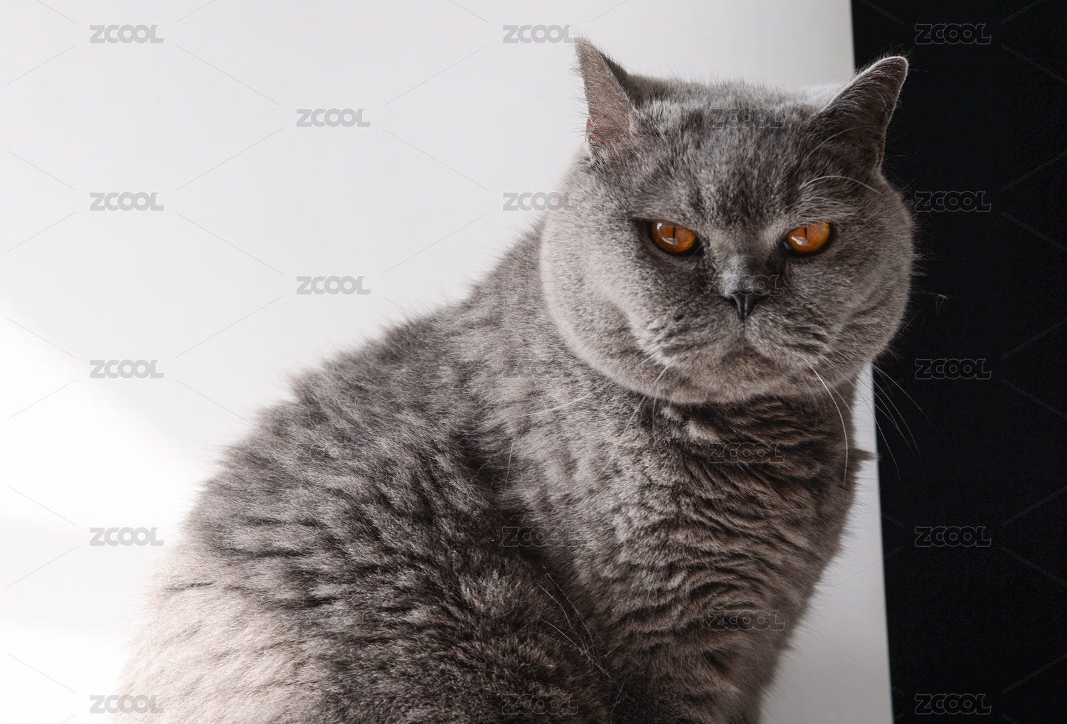 有些肥胖英国短毛猫舔完毛后看着周围的环境