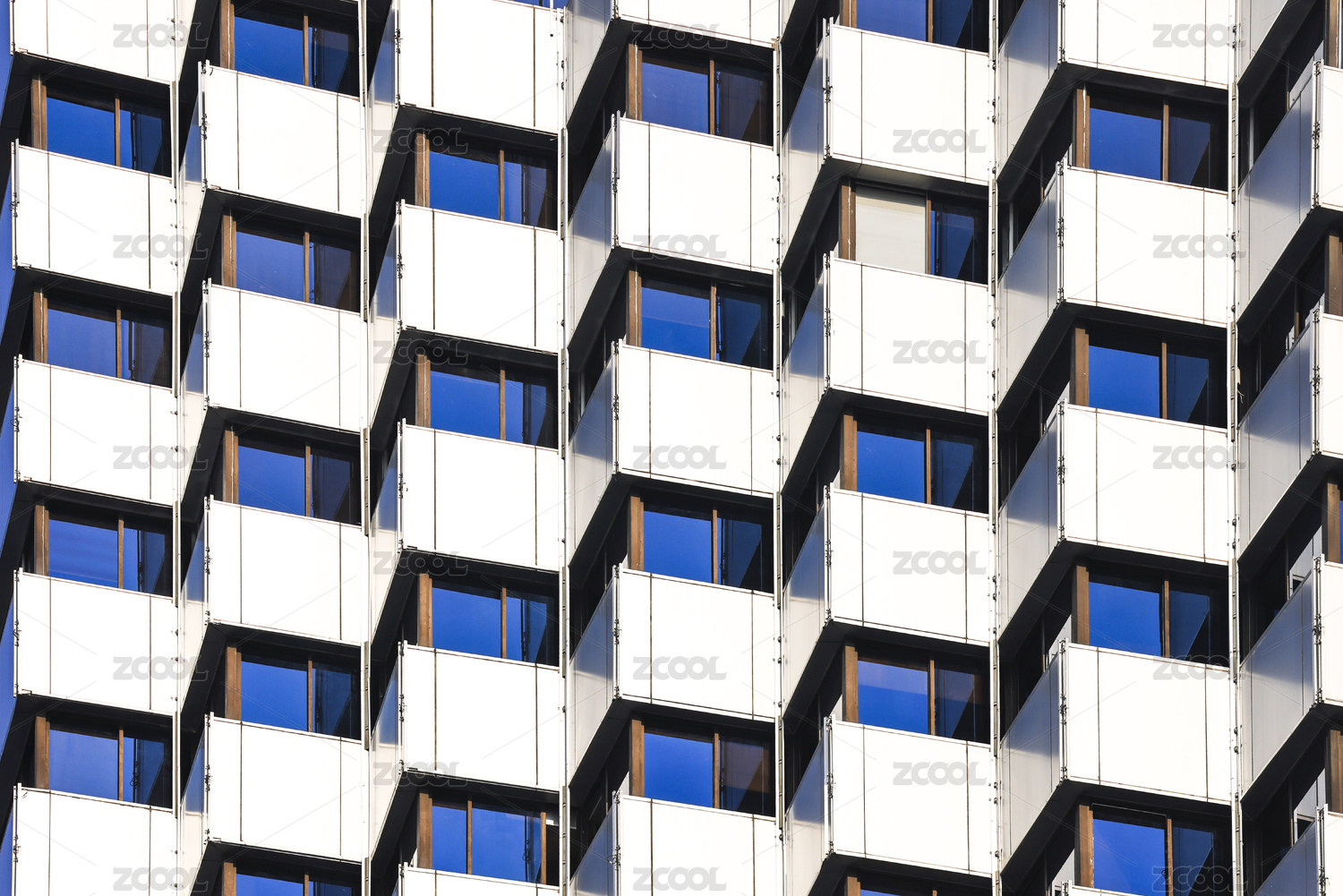 城市住宅建筑物上规则整齐的阳台窗户特写