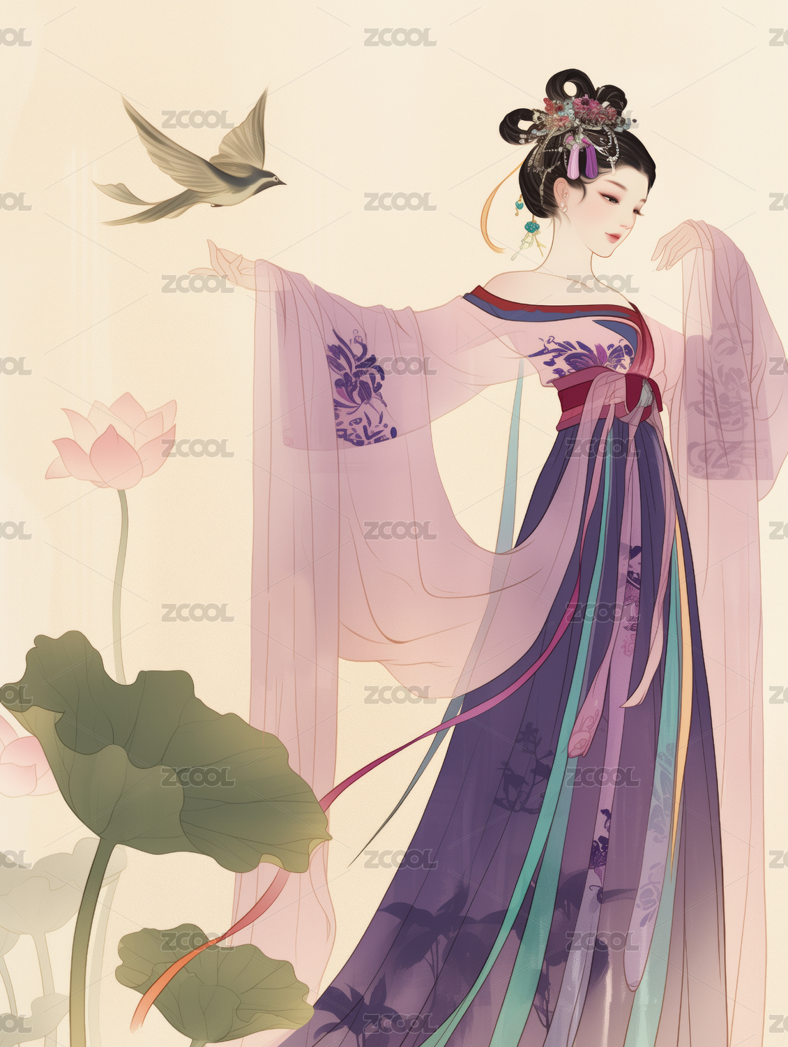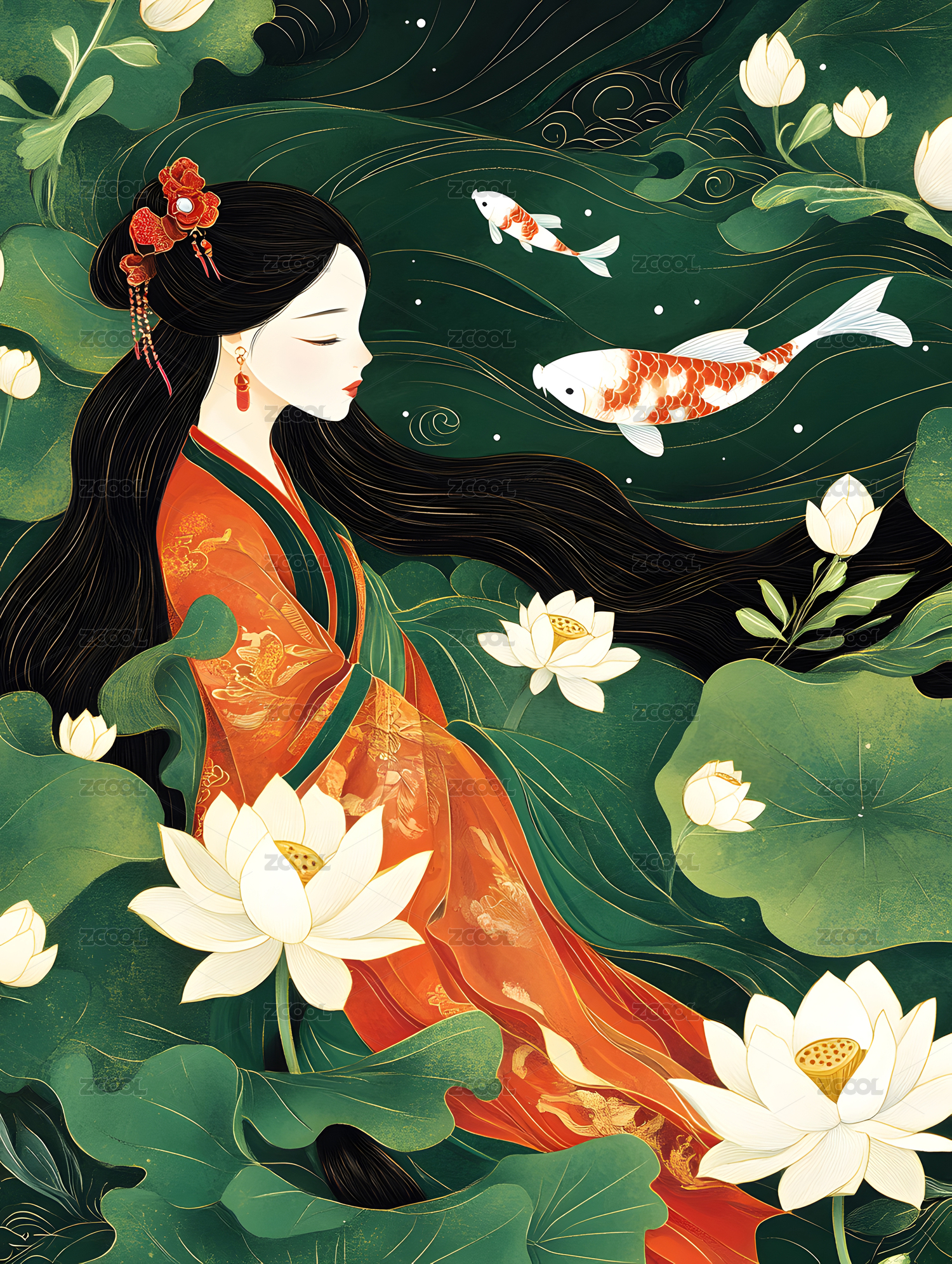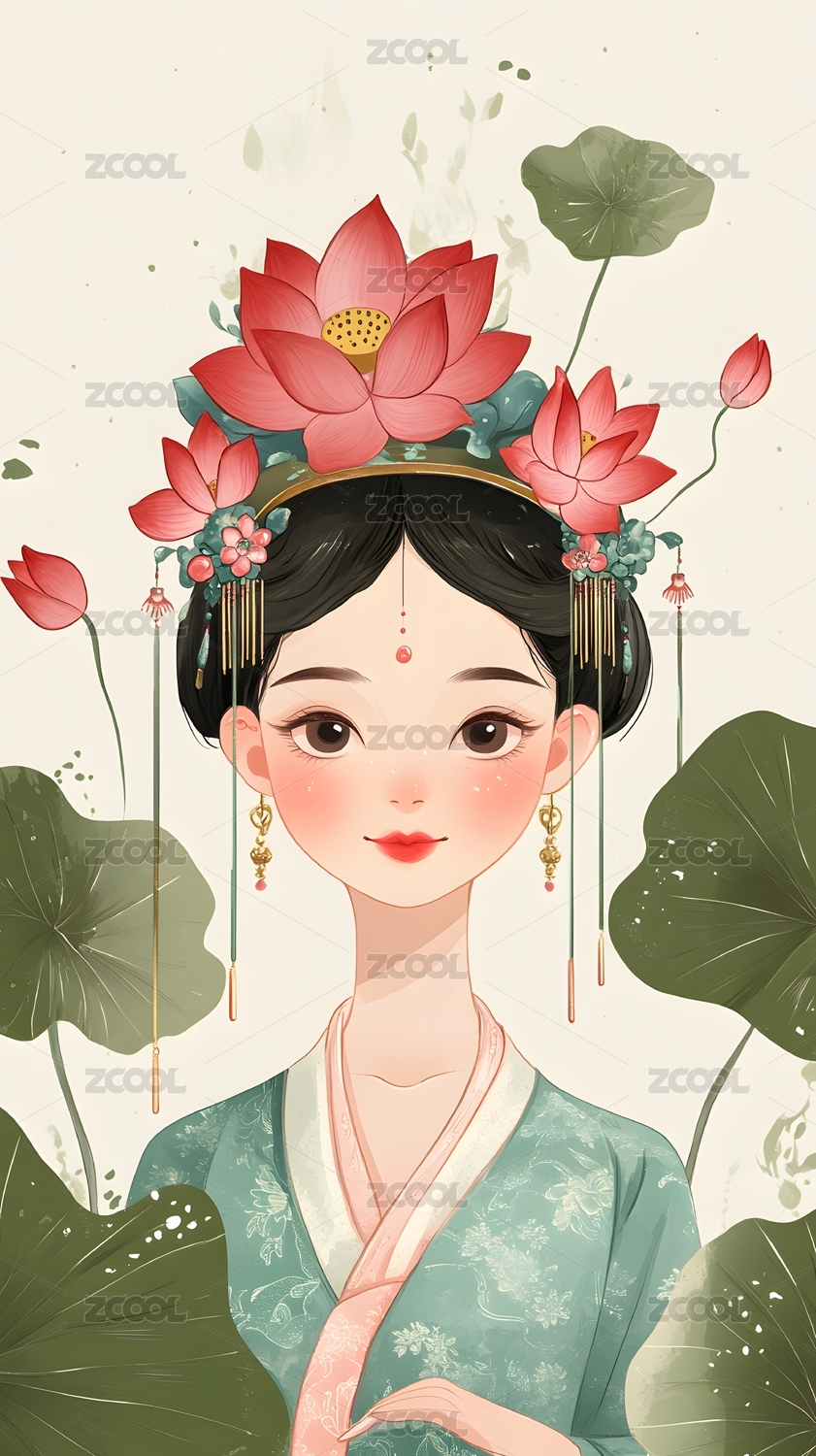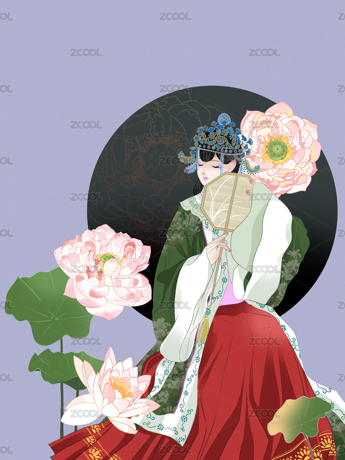 扁平风格的中国风荷花荷叶和少女工笔绘画