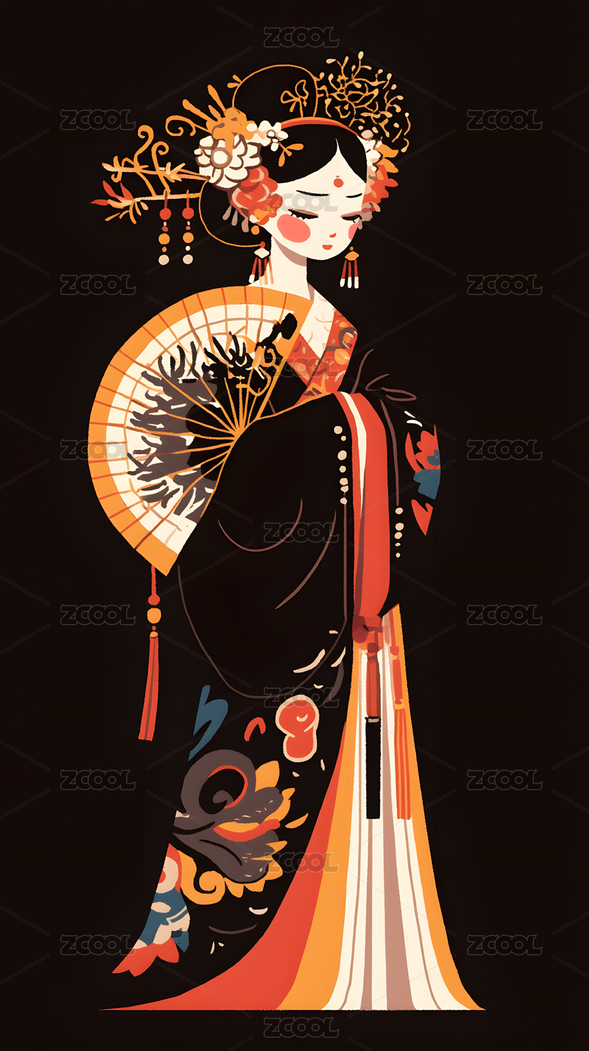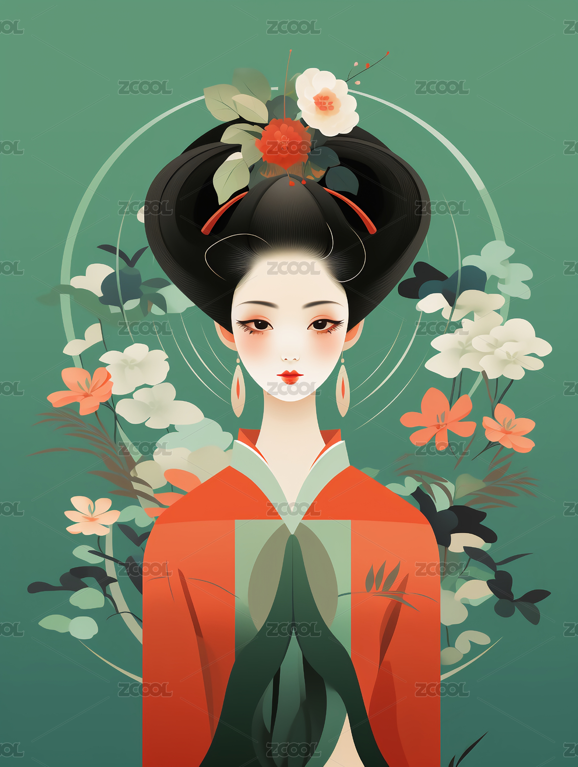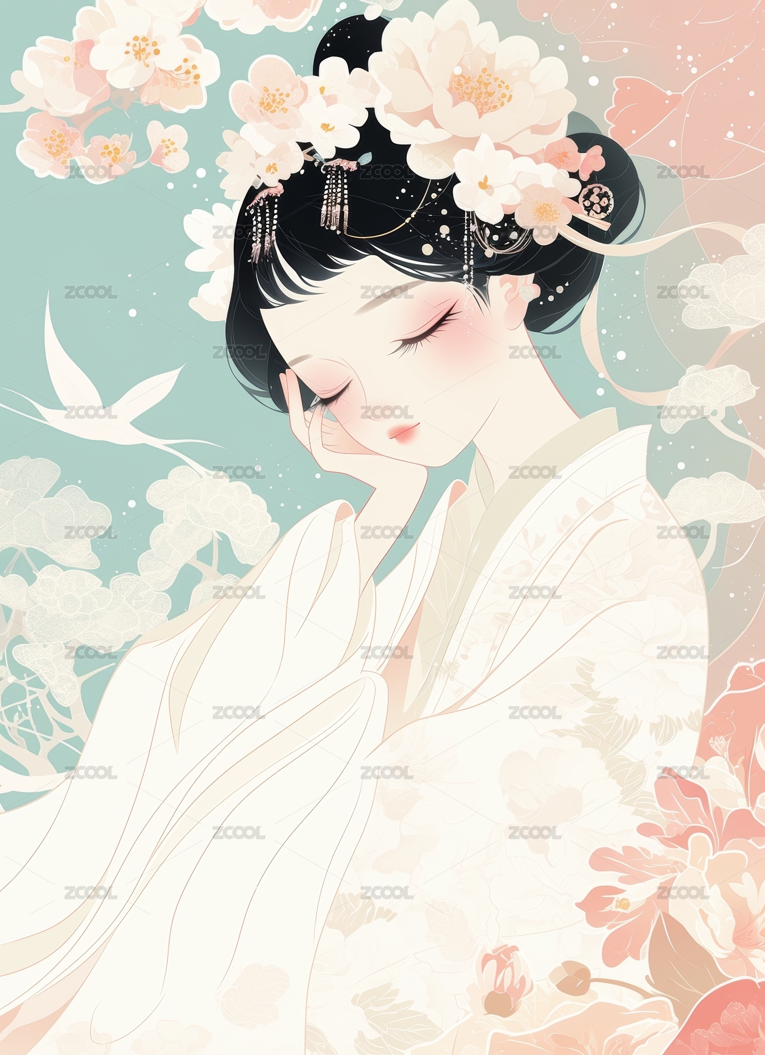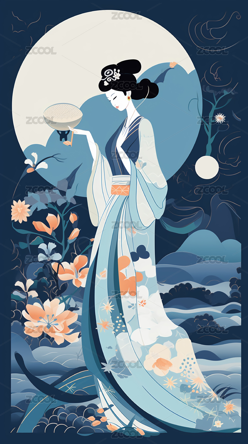 扁平风格的中国风荷花荷叶和少女工笔绘画