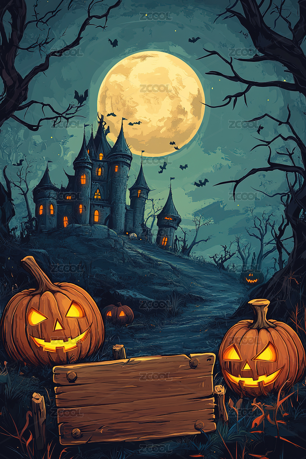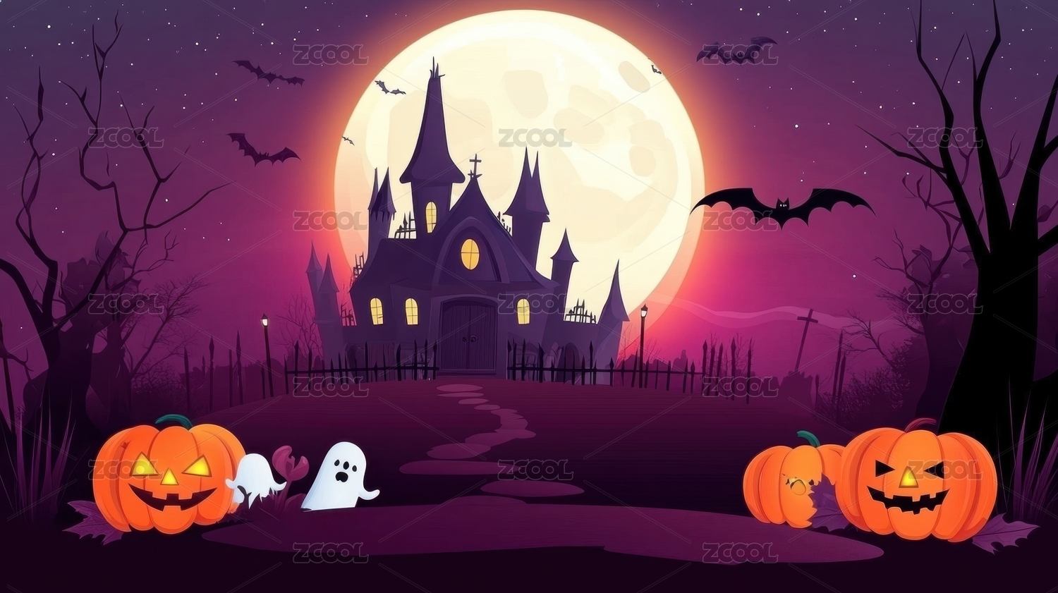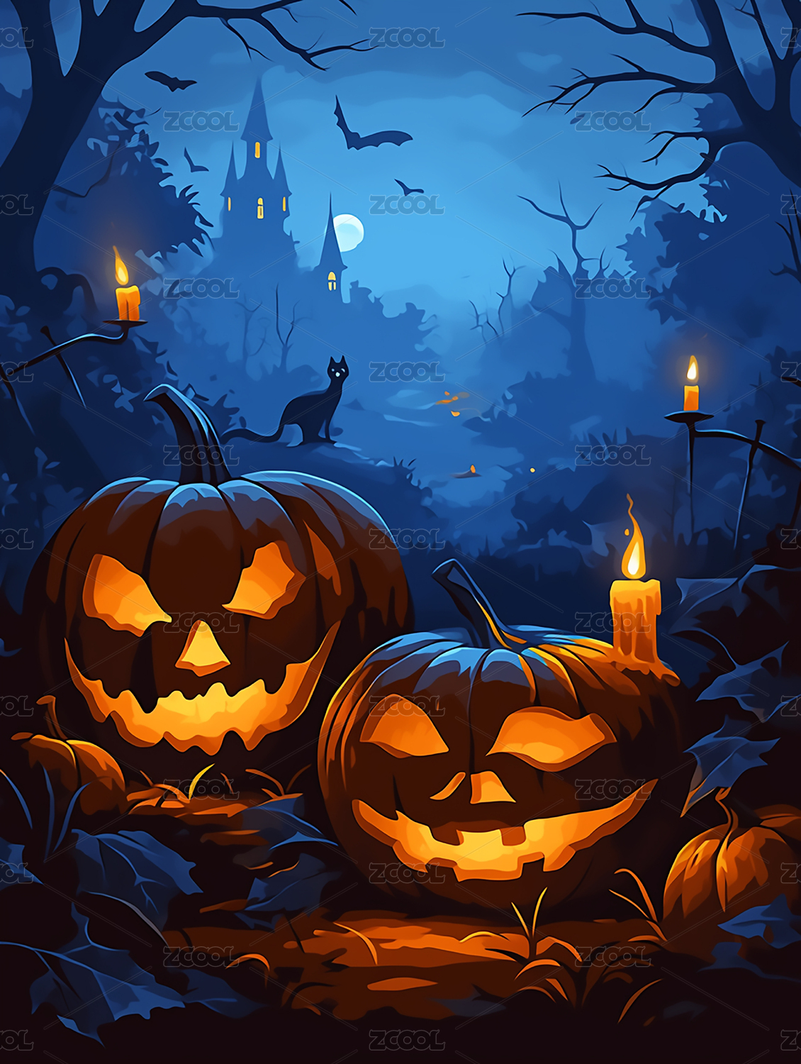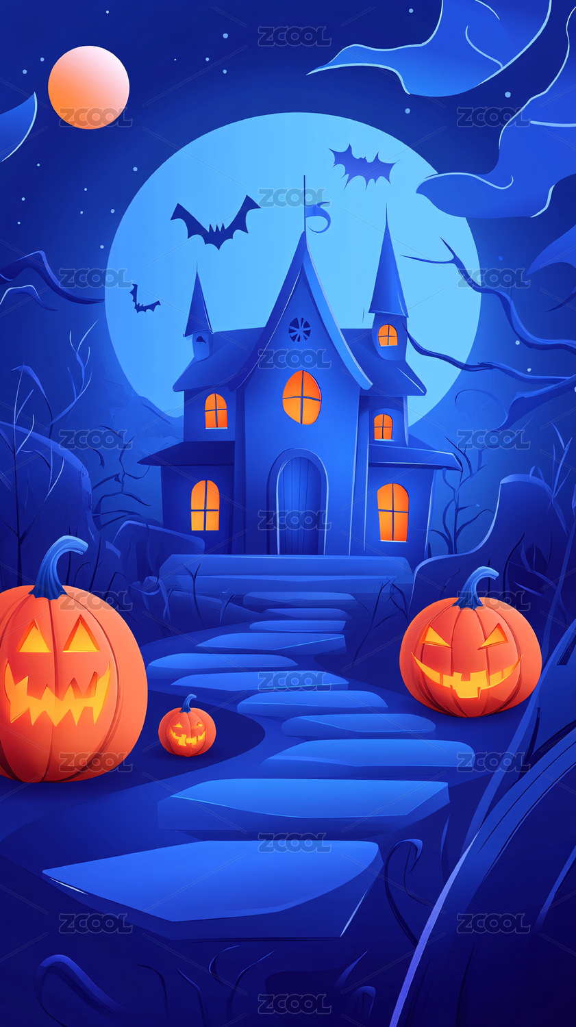 万圣节恐怖房屋夜晚城堡复古装饰节日插画