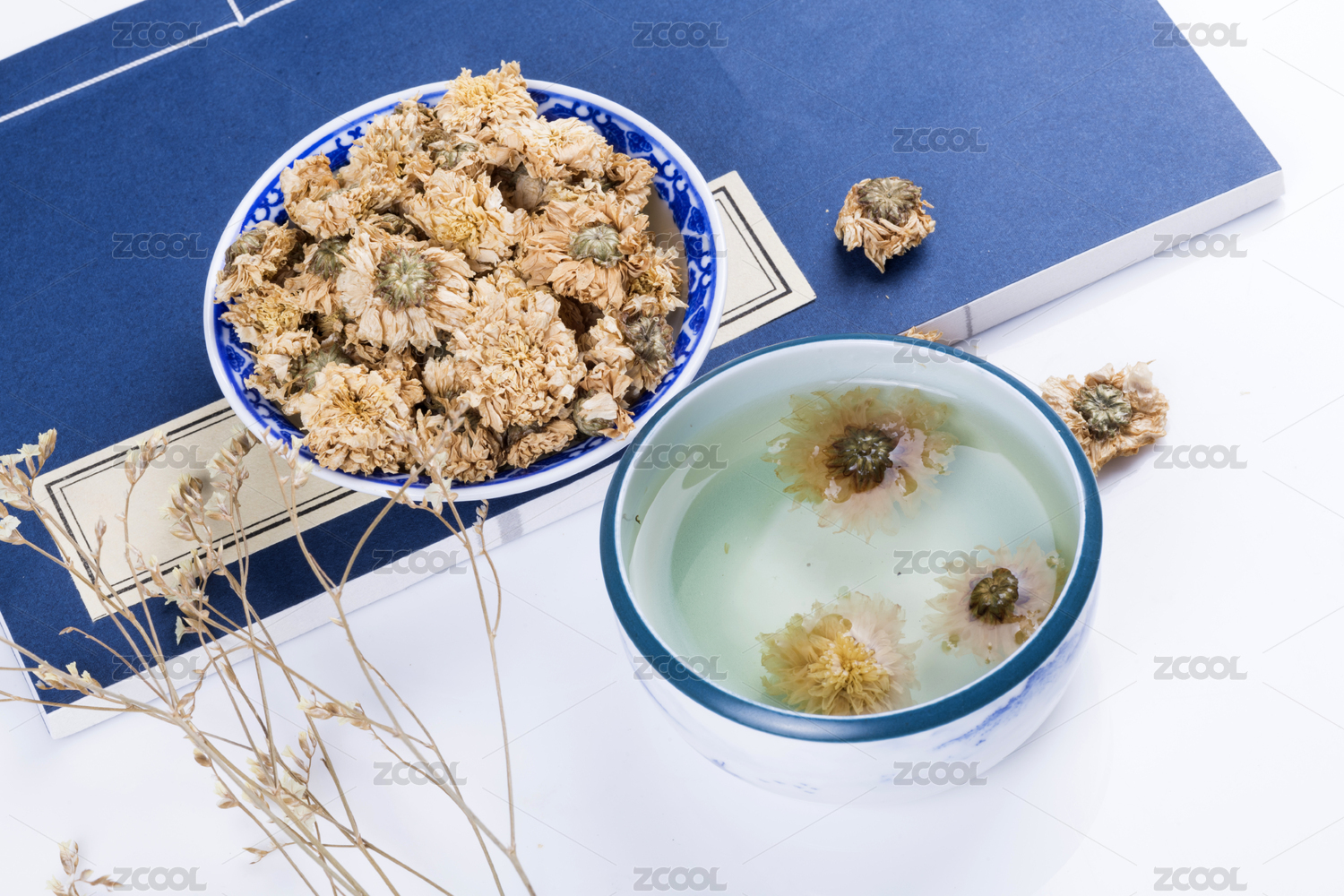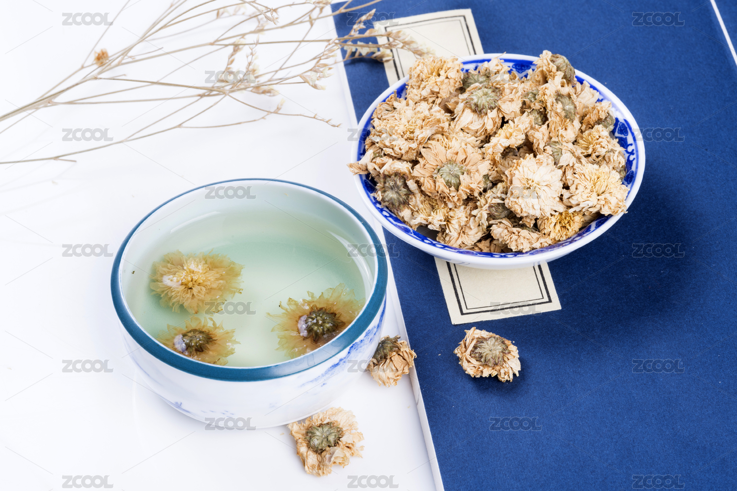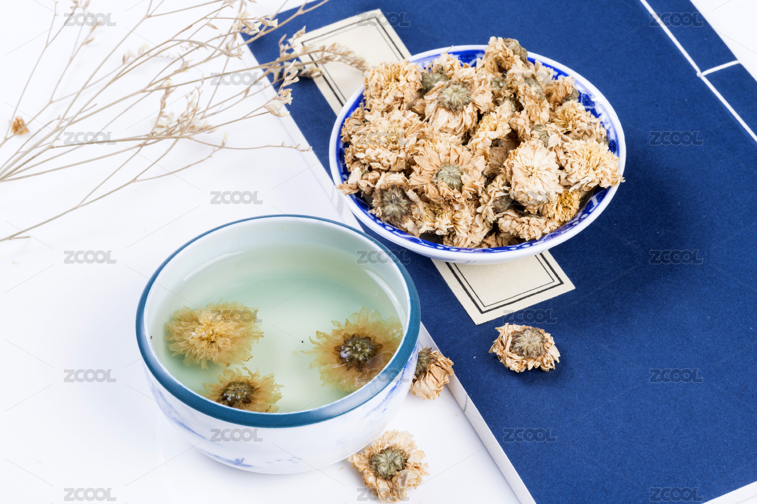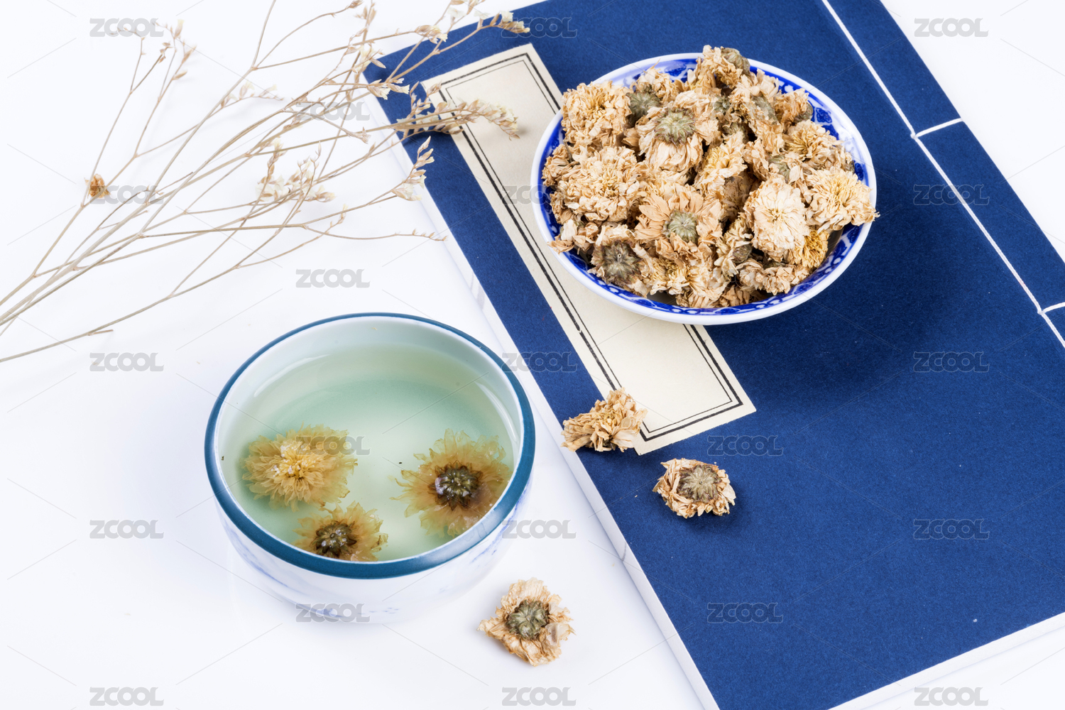中国古典风格的多种健康花茶与茶杯特写