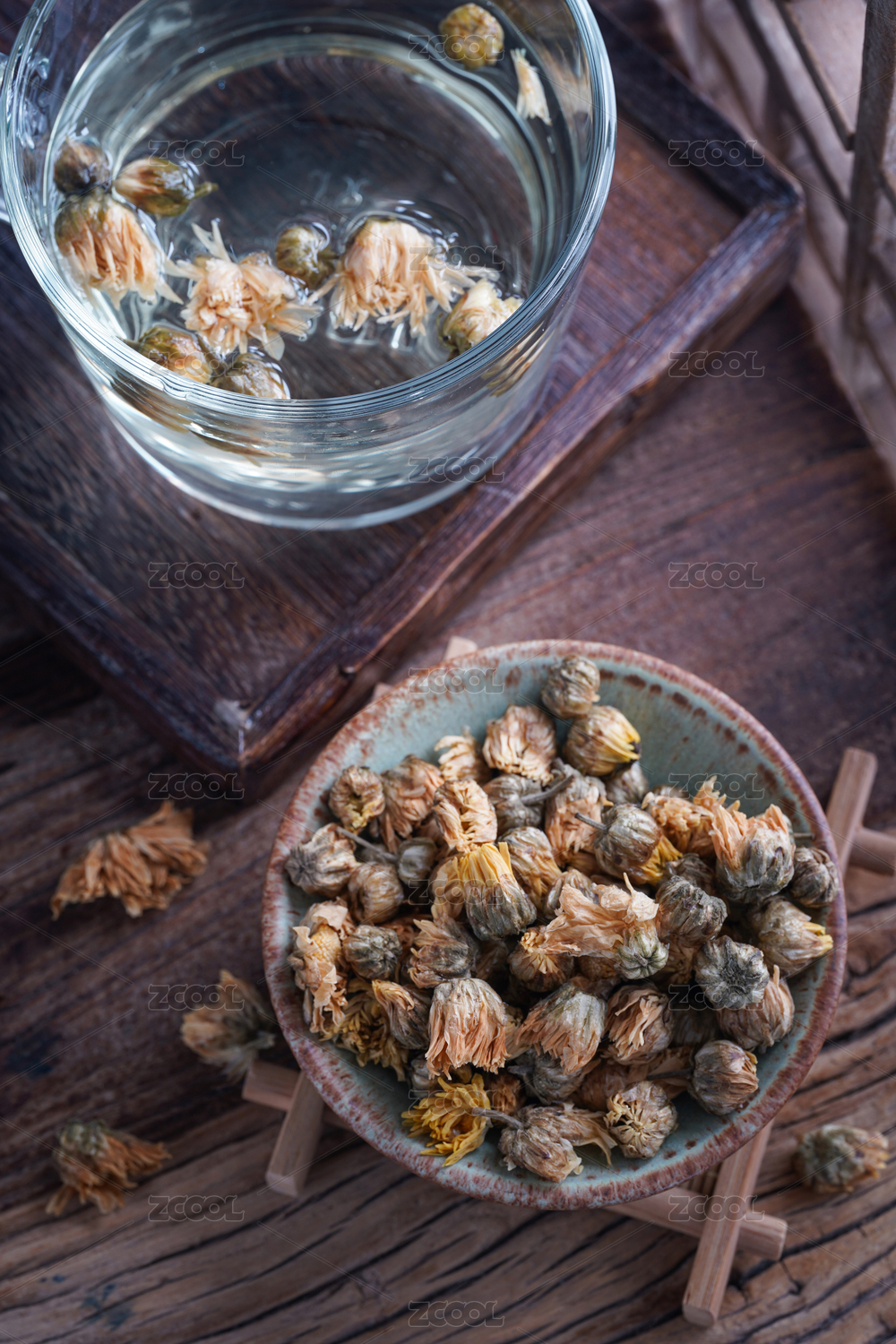 木板上的花草茶胎菊