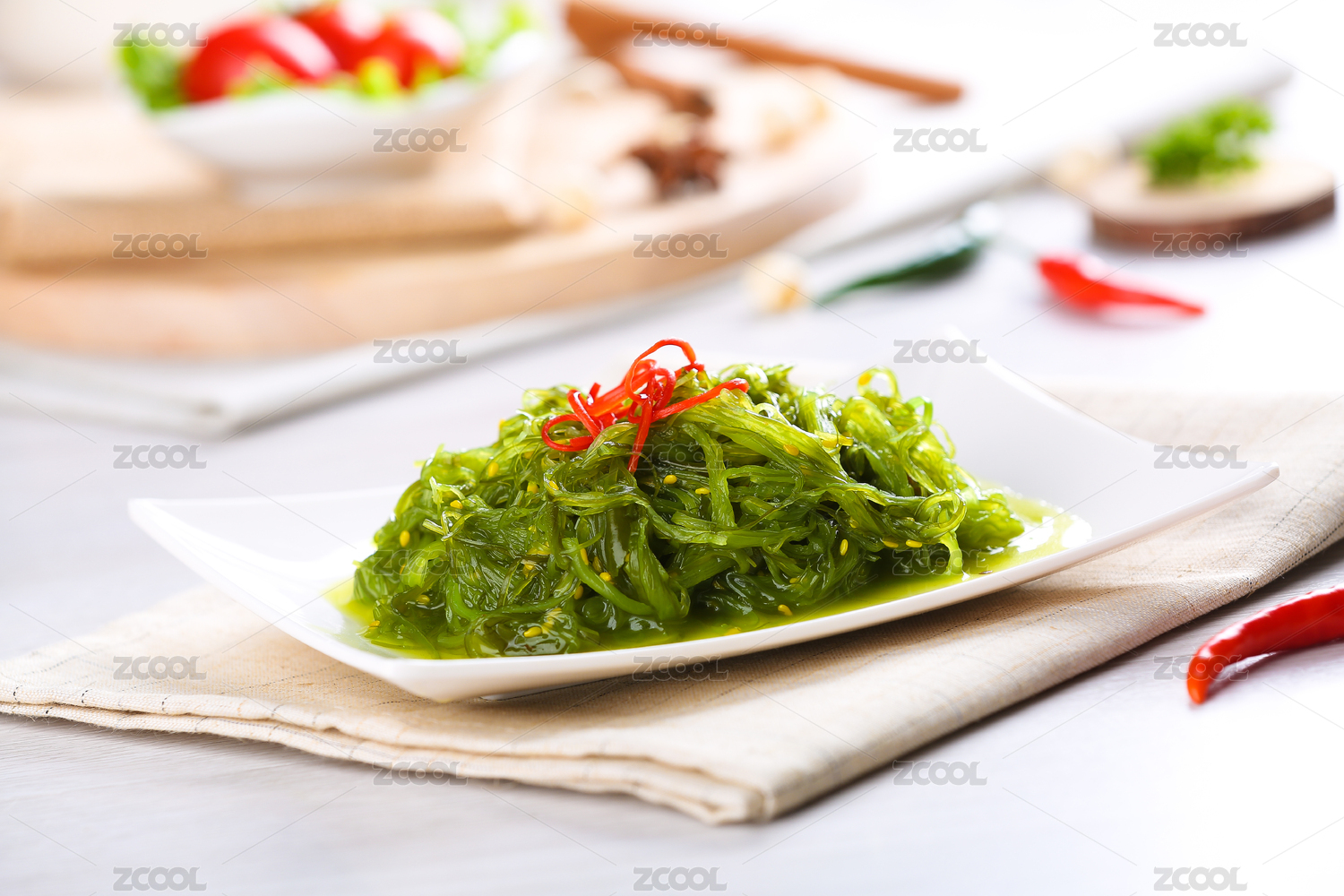 裙带菜丝,裙带菜,裙带丝,筷子夹裙带菜丝,叉子叉裙带菜丝,海芥菜,裙带,海产品,一盘,茶水