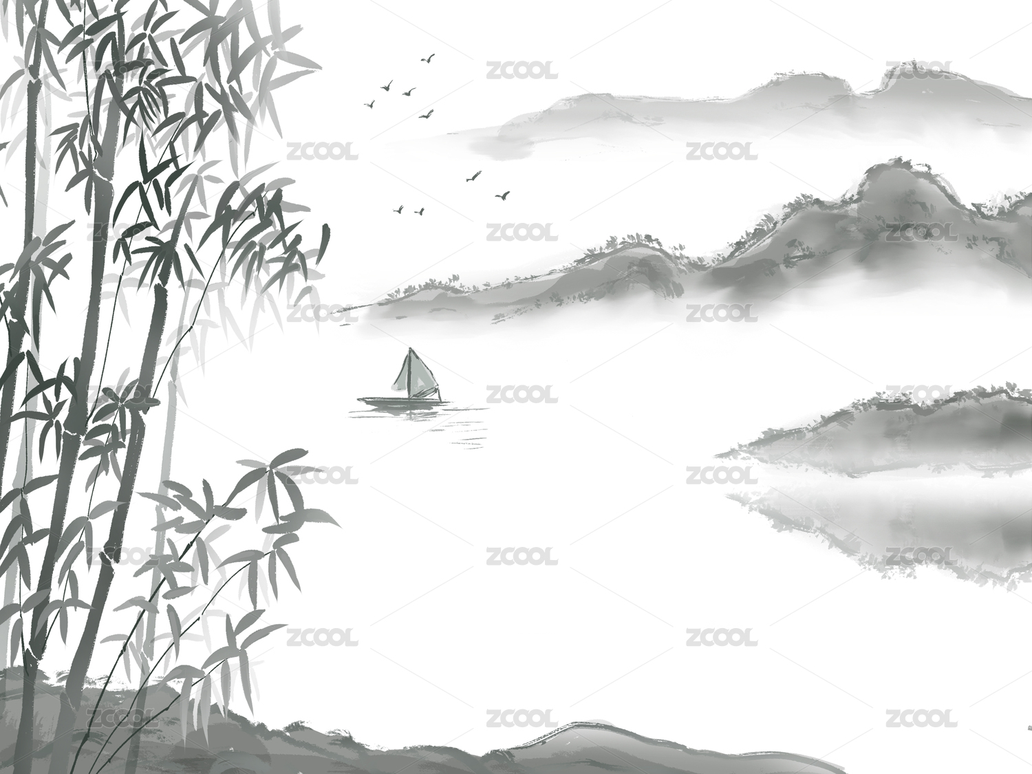 水墨山水竹子山脉河流大雁帆船