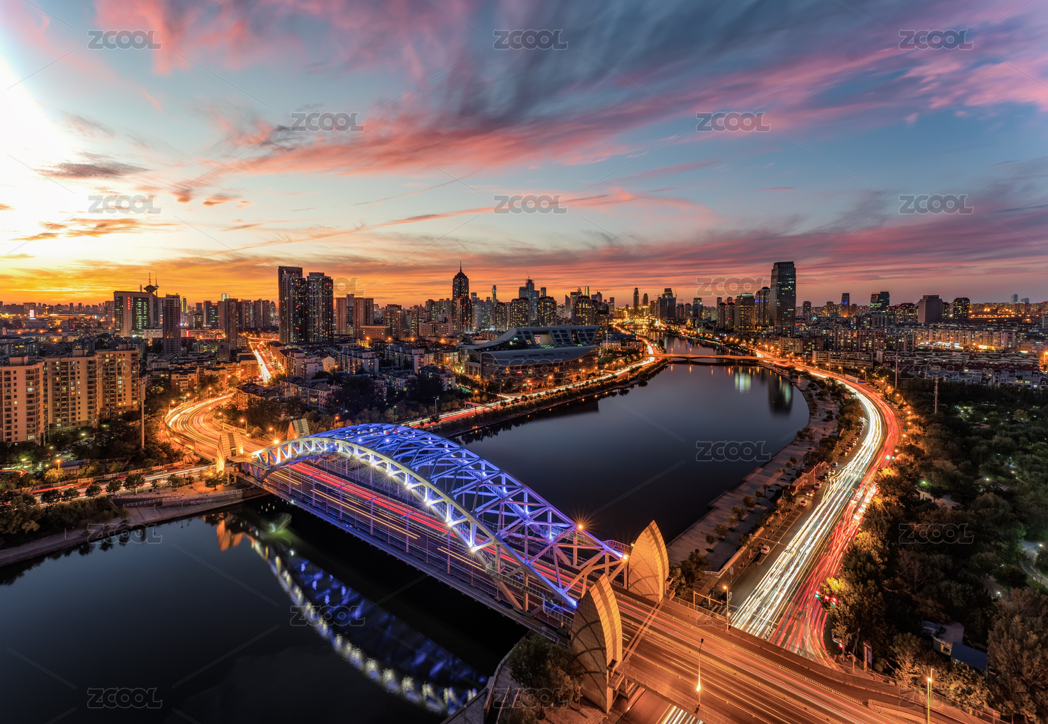 日落天津海河沿岸北安桥城市建筑夜景风光航