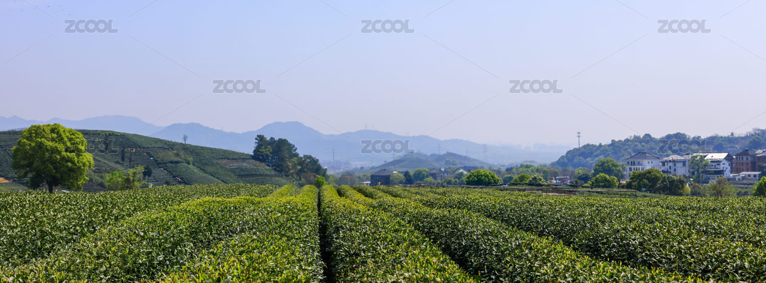 中国杭州龙坞春天里的茶园风光全景图