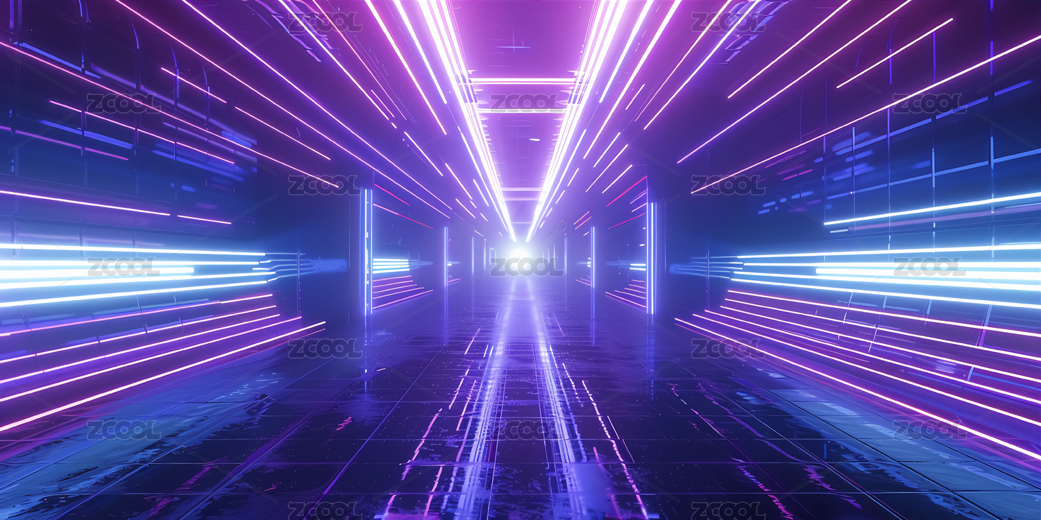 抽象隧道,地板上发光的霓虹线条与灯光效果