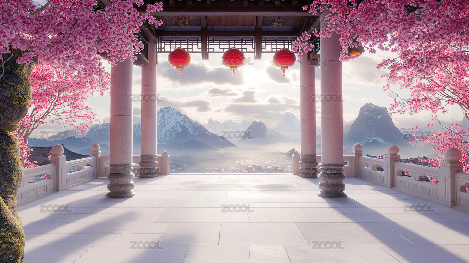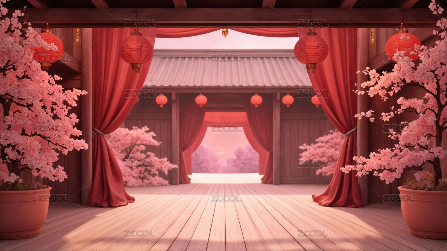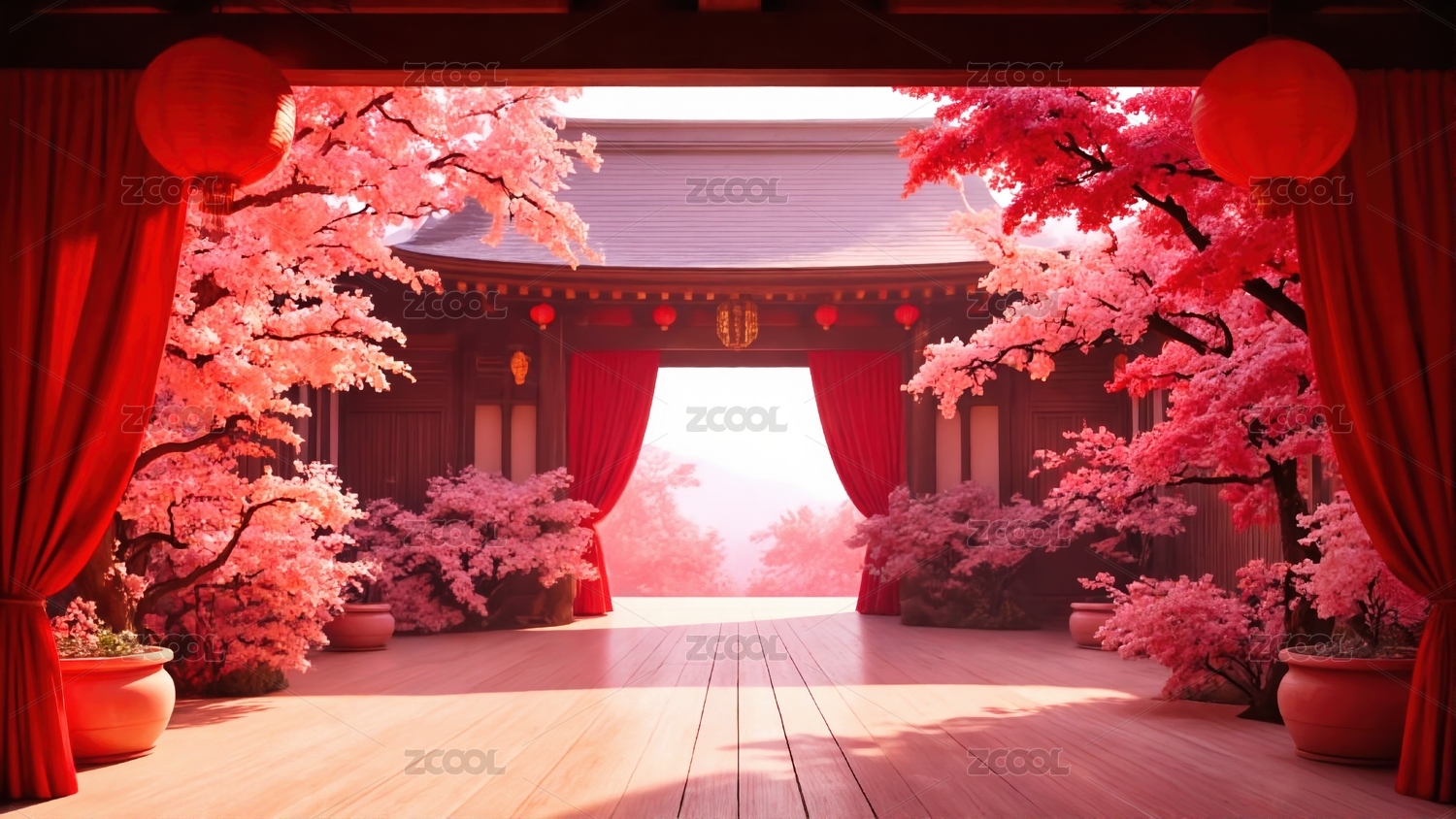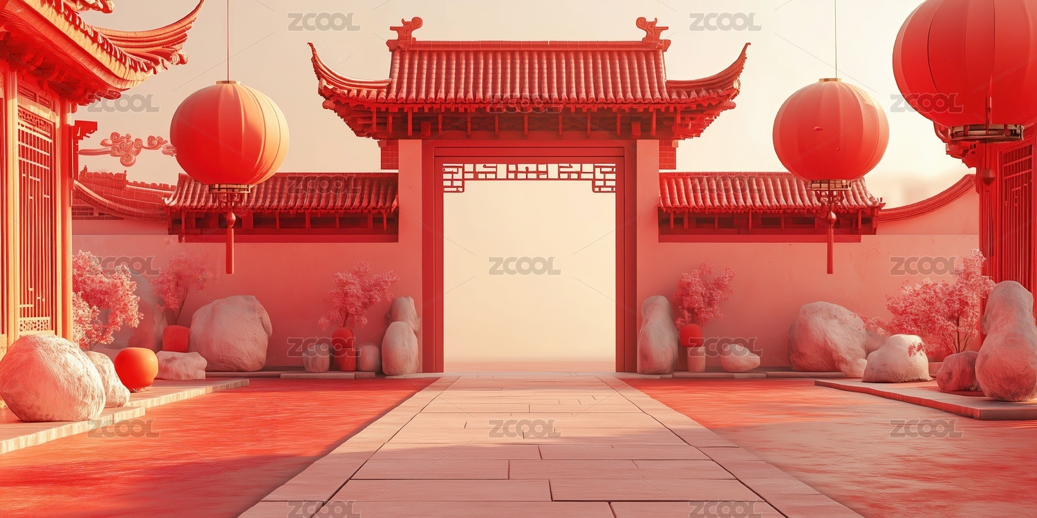 国风国潮新中式节日挂灯笼的中国红古典大门