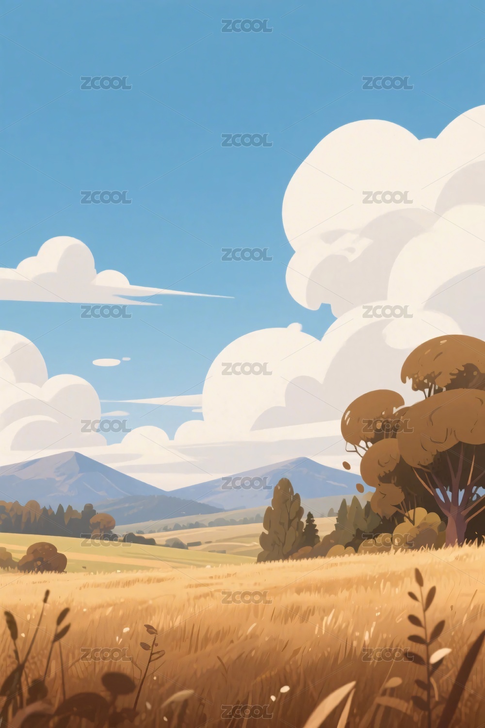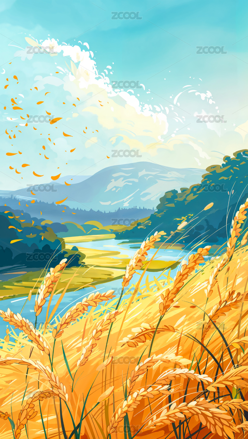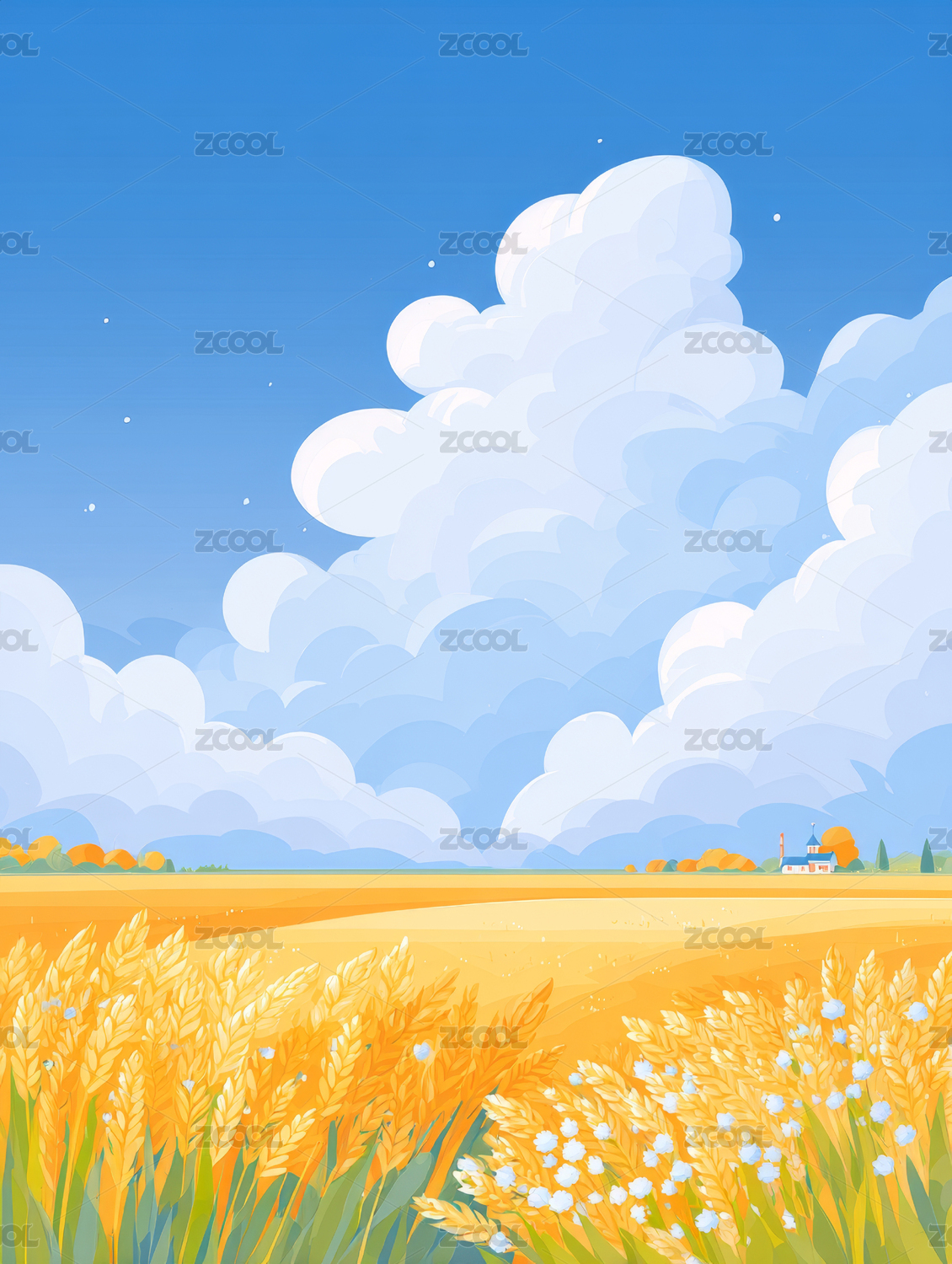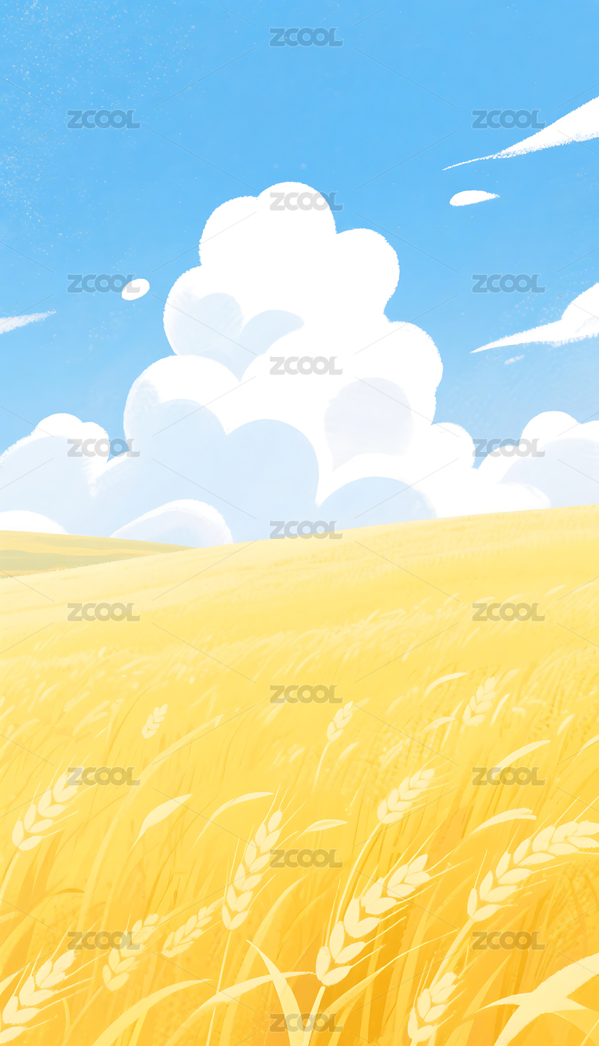 夏天晴朗天空下成熟的金黄色麦田插画绘画