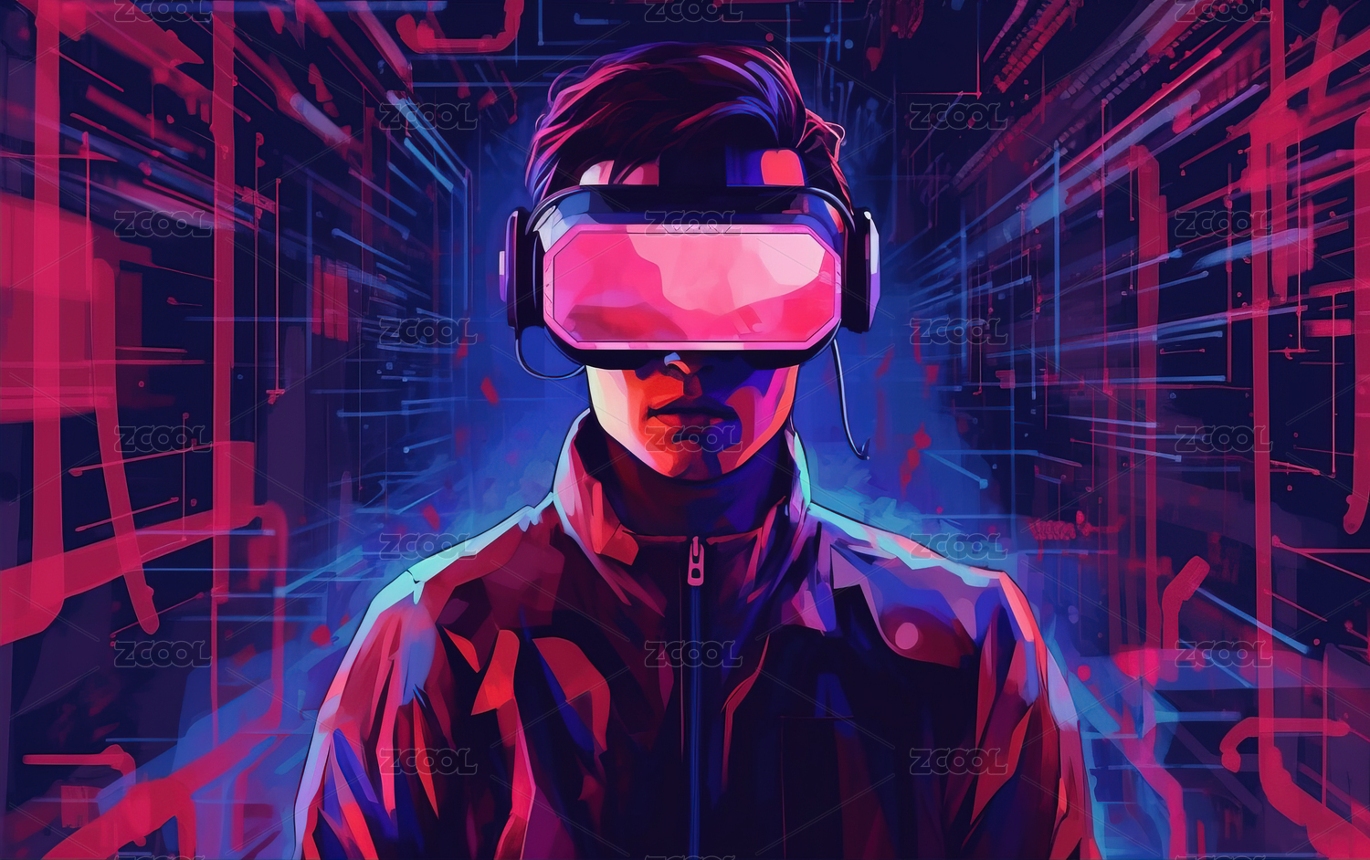戴着VR眼镜的男性炫彩烟雾方块插画