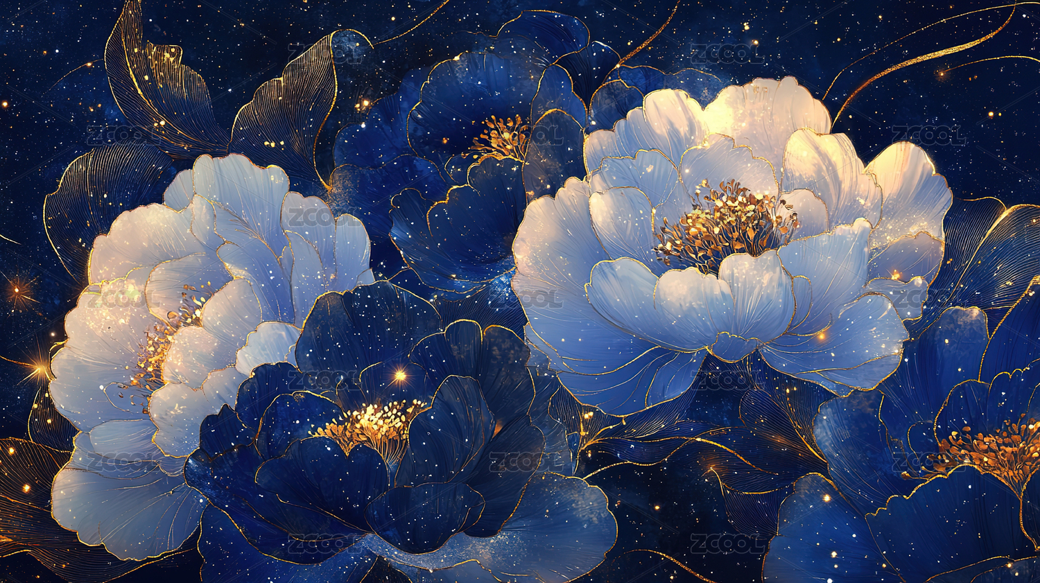 装饰,背景,蓝色,花朵,星空,金色,线条,唯美,浪漫,梦幻