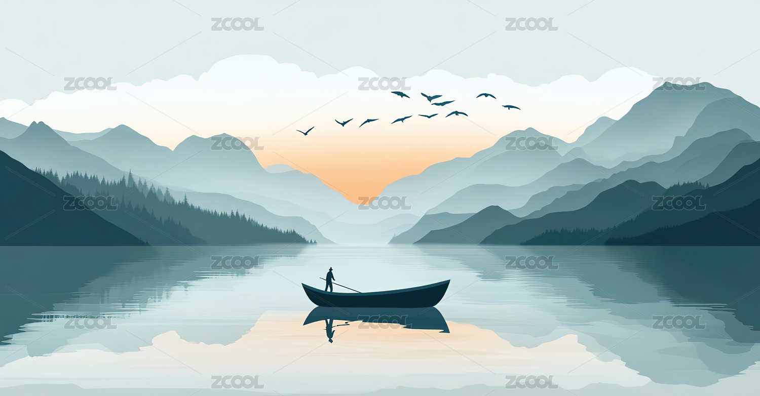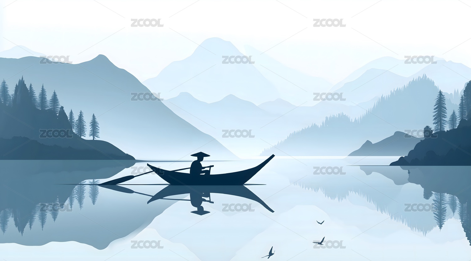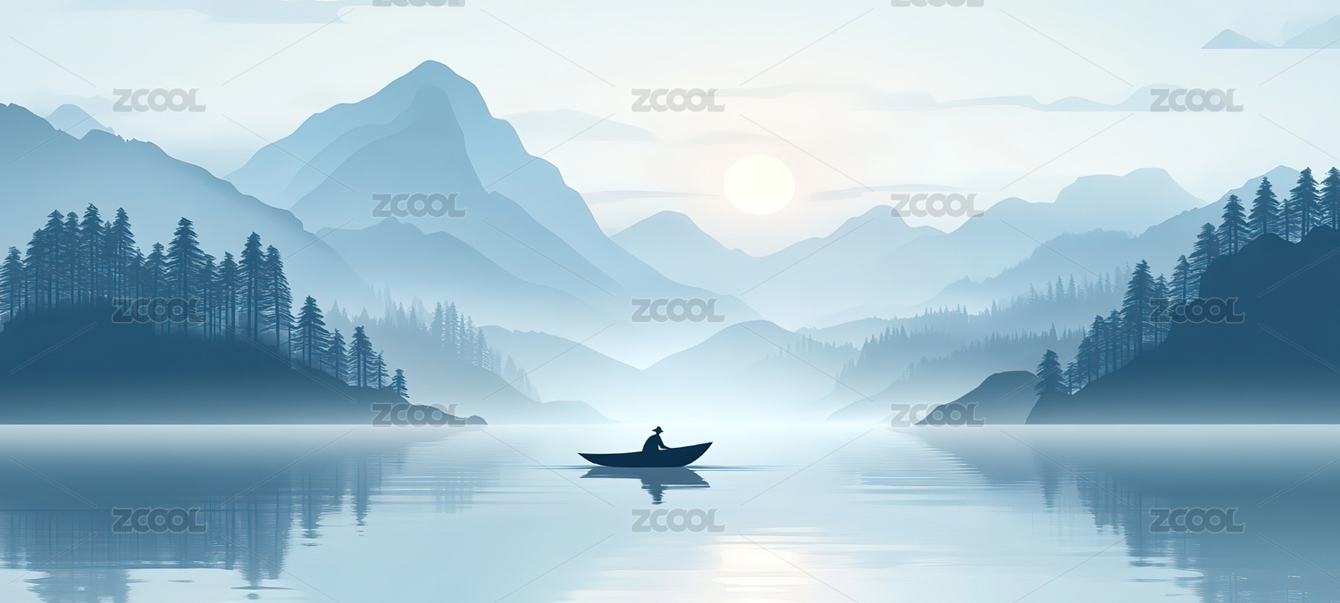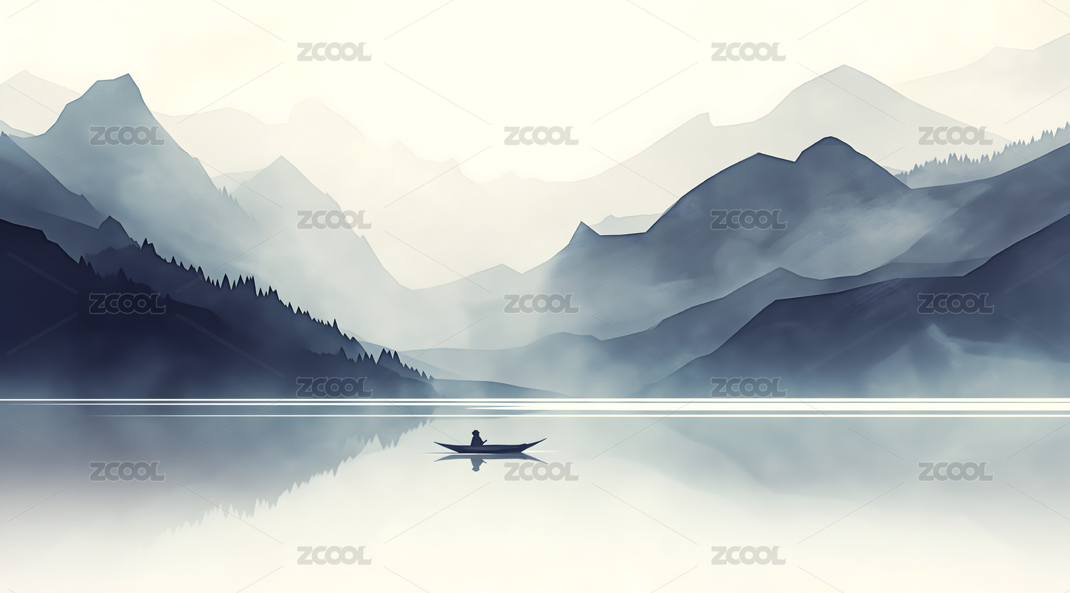 大山,河流,河水,蓝色,漂浮,雾,小船,小河,云,自然风景
