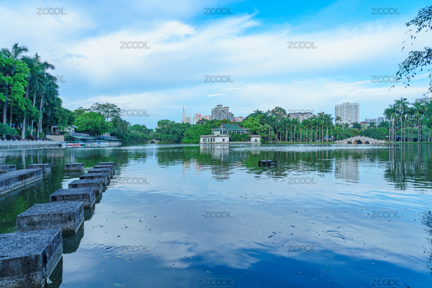 广西南宁市人民公园湖泊树林与城市建筑全景