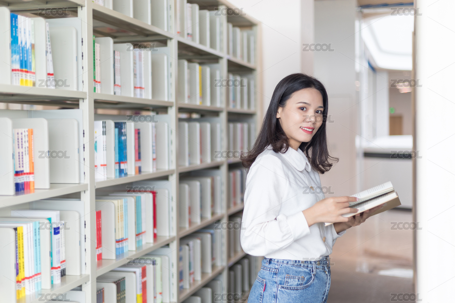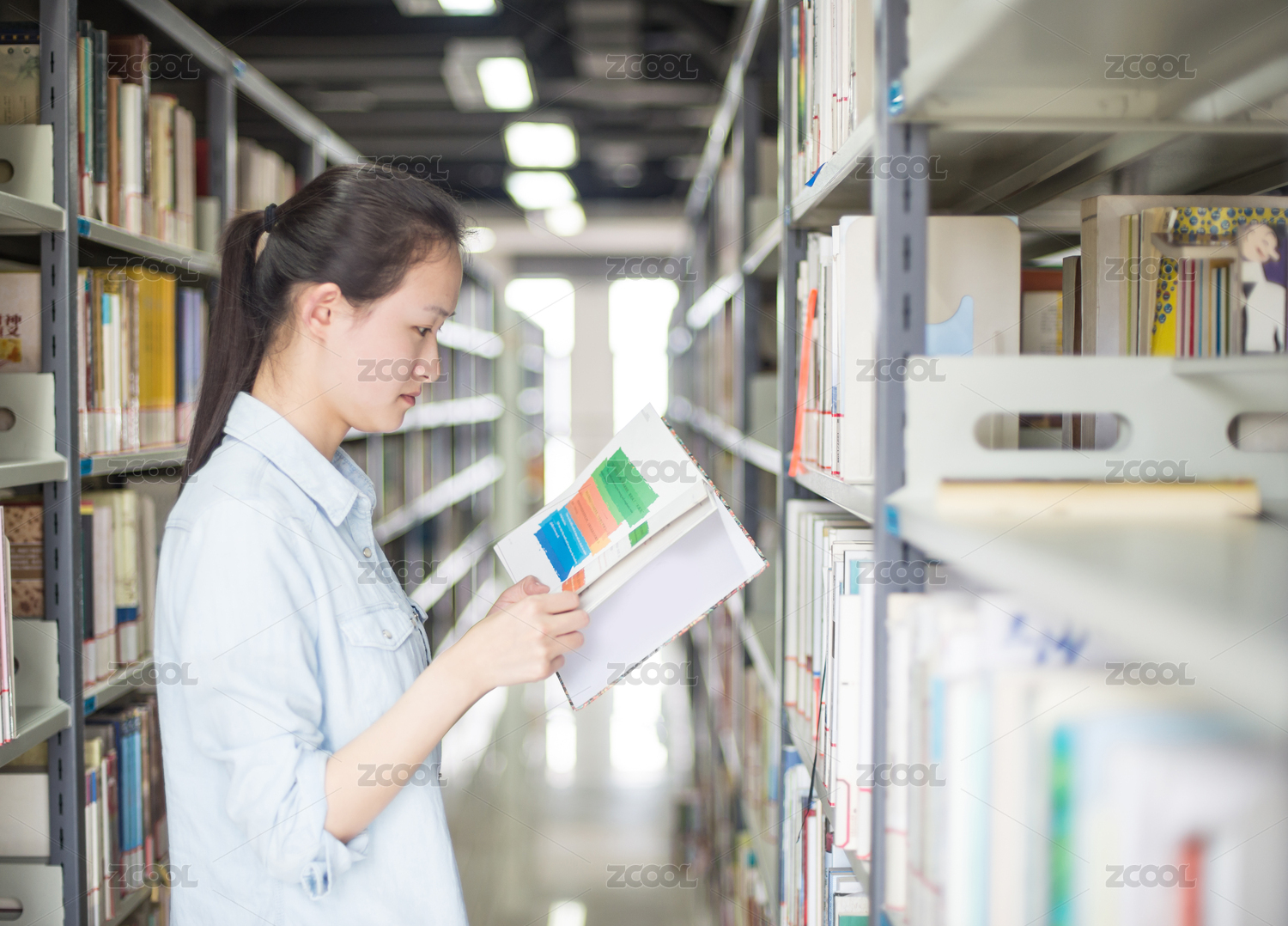 图书馆书架前一个漂亮的女大学生在看书