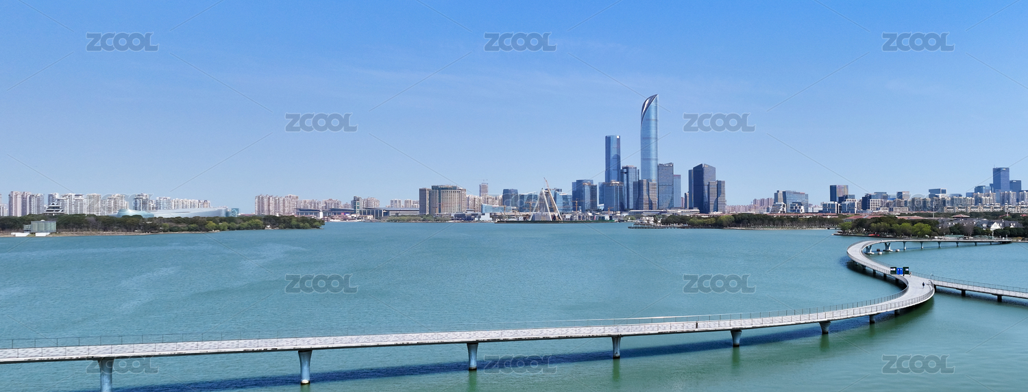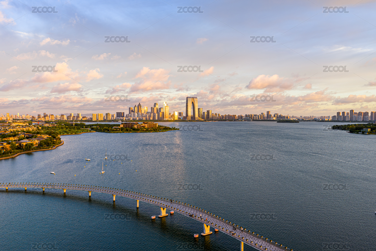 中国江苏苏州金鸡湖景区傍晚城市风光