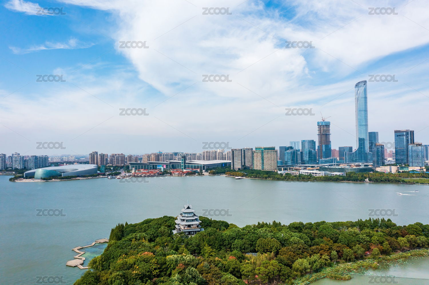 航拍苏州金鸡湖湖东现代滨水城市风光