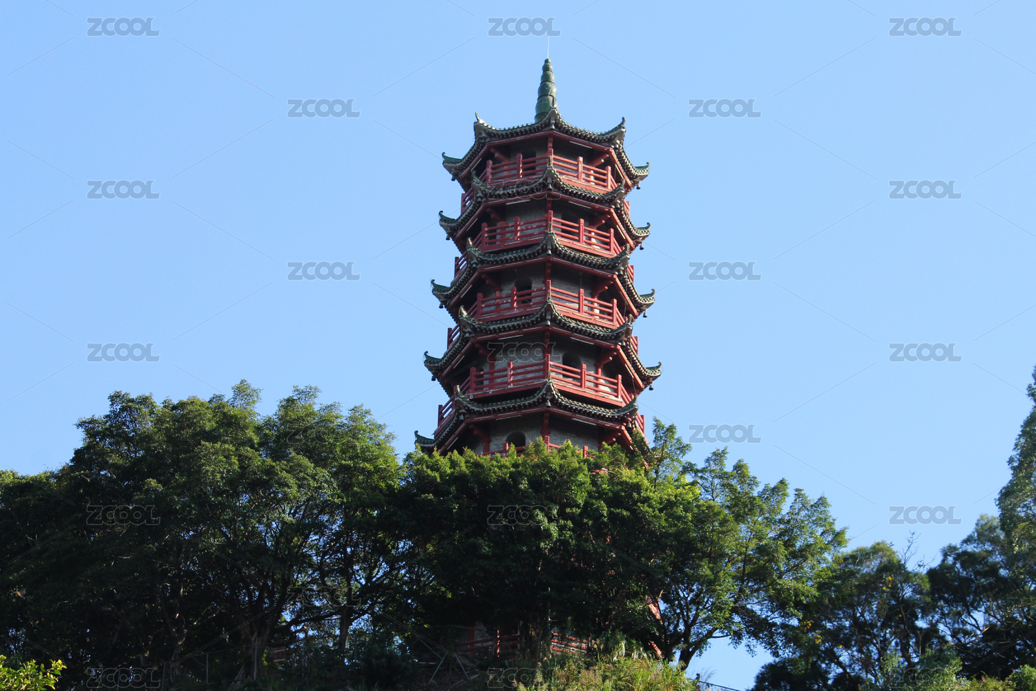 山顶一座中国传统宗教建筑中的佛塔