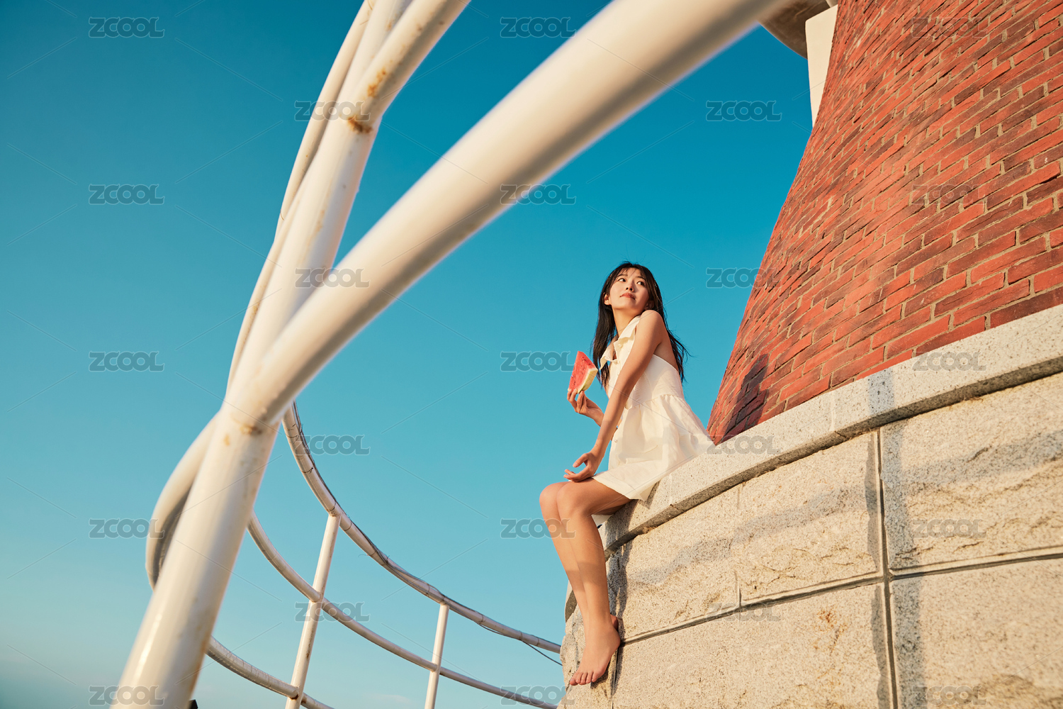 盛夏夕阳湖边码头灯塔上吃西瓜的少女