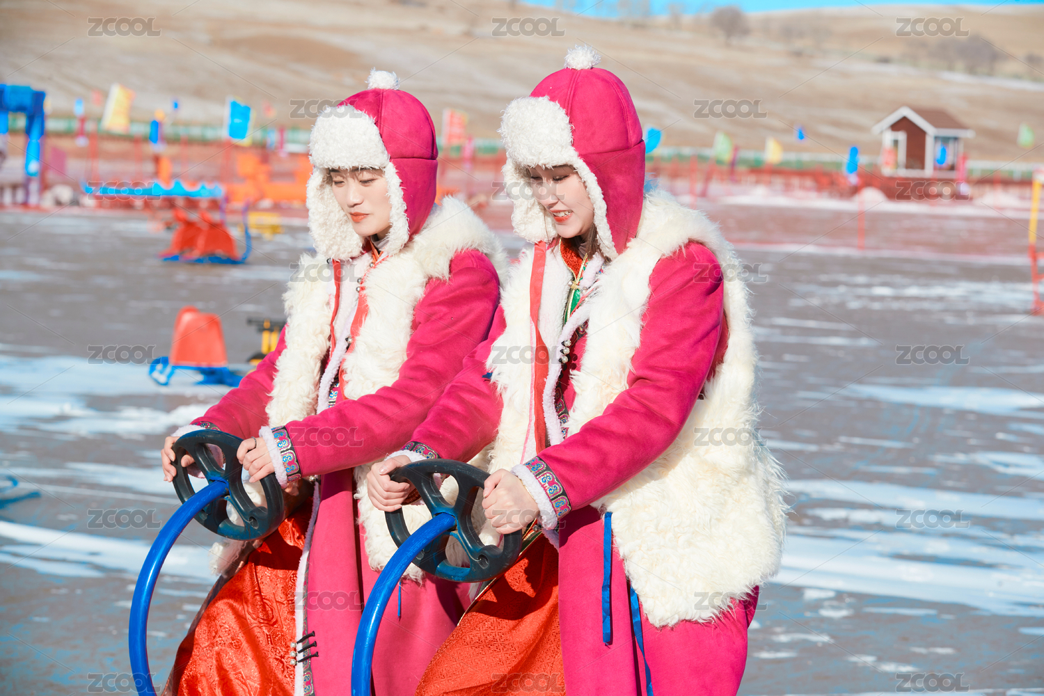 冬天在冻结湖面玩嬉戏滑冰的闺蜜少女