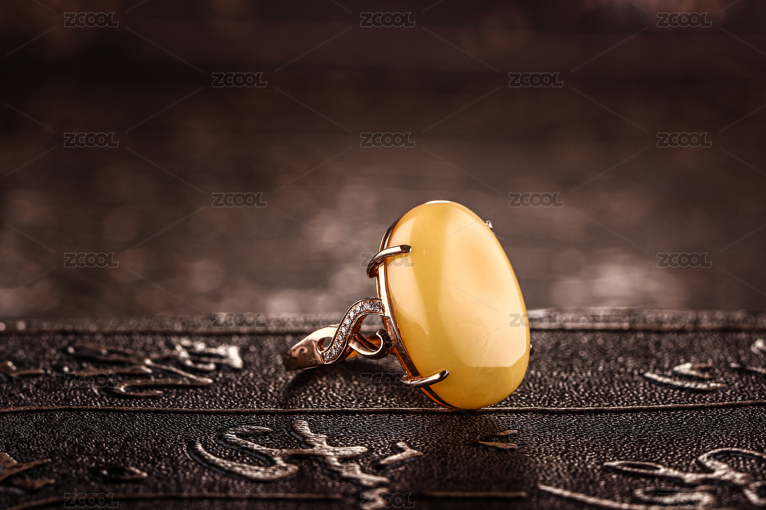 琥珀蜜蜡戒指放在深色的场景中