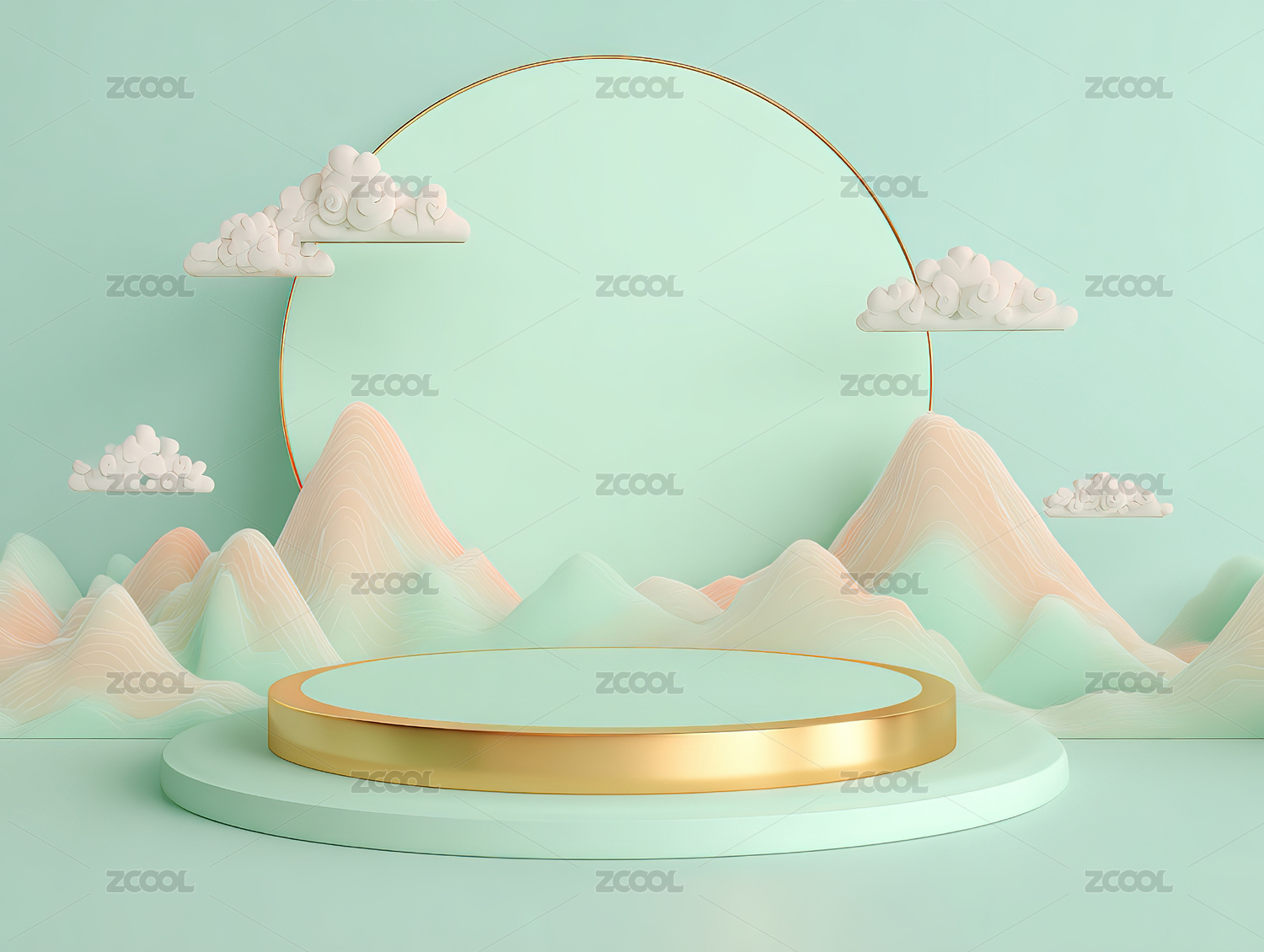 产品展台,电商,电子商务,中国风,三维图形,山峰,红色,圆形,树,云