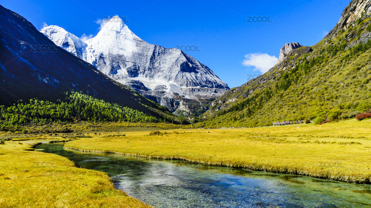 四川稻城亚丁的神山央迈勇雪山以及洛绒牛场的河流