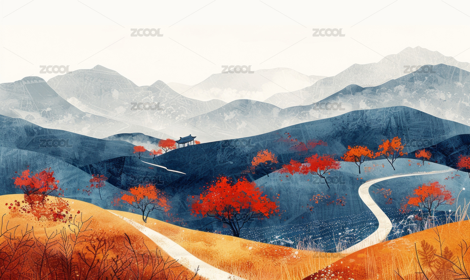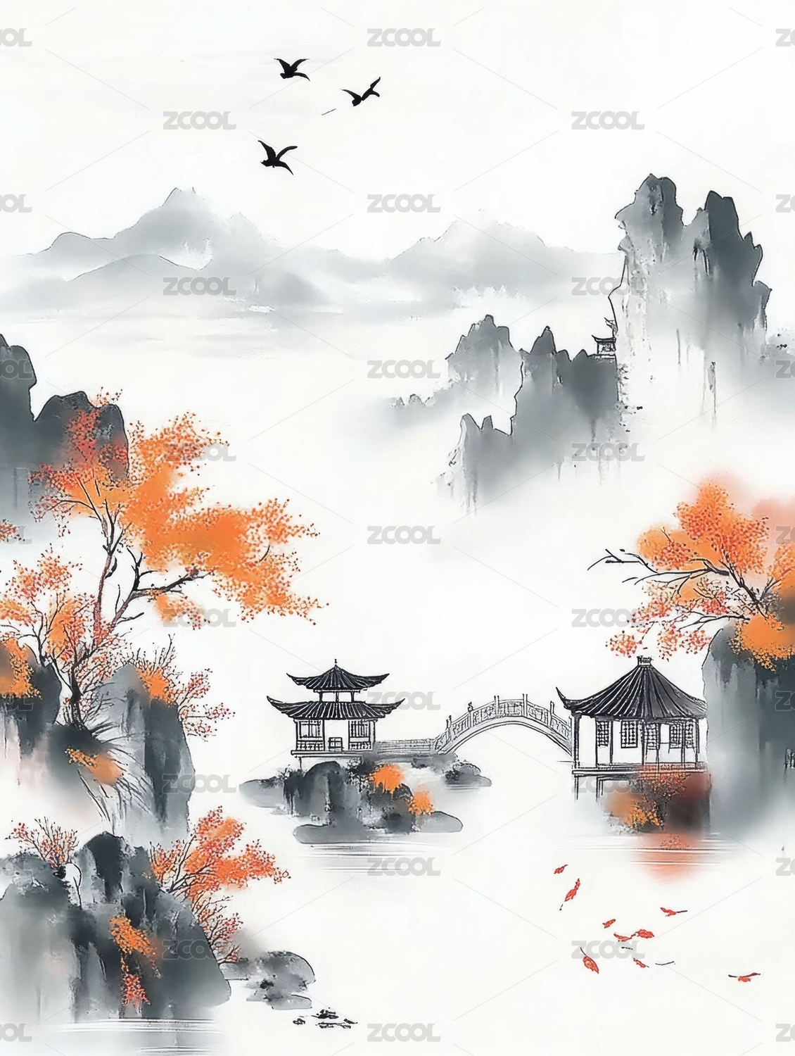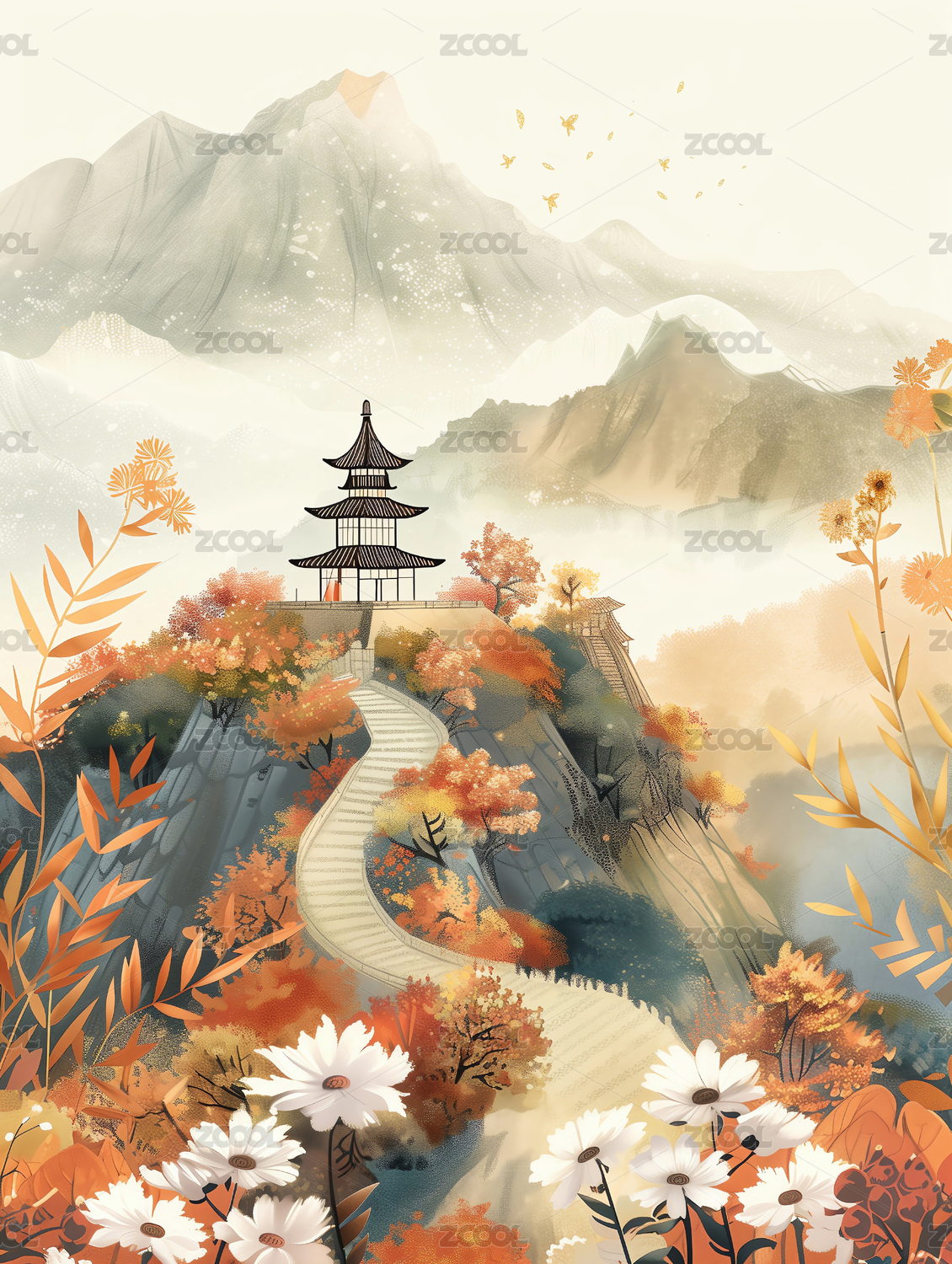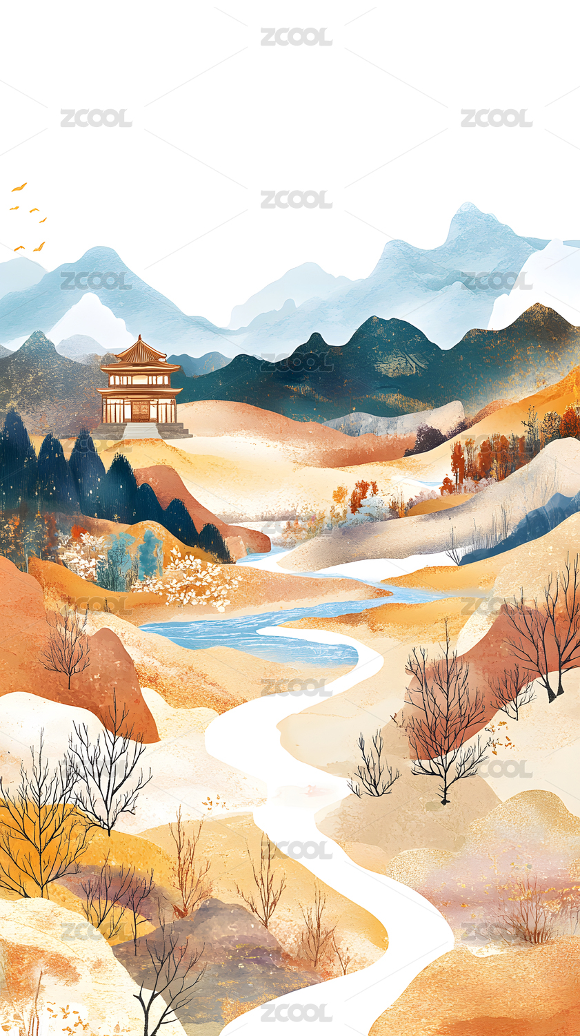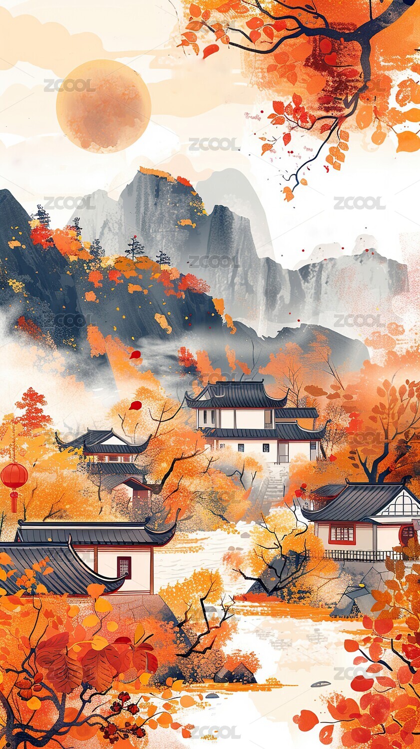 中国水墨风格的秋日风景插画