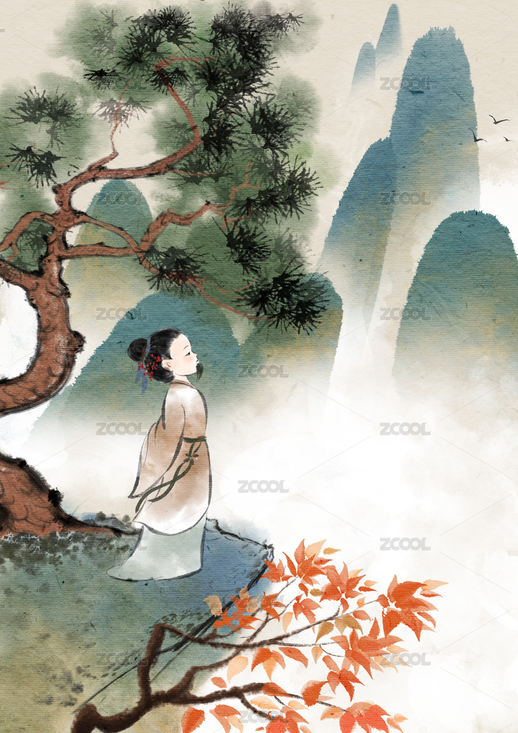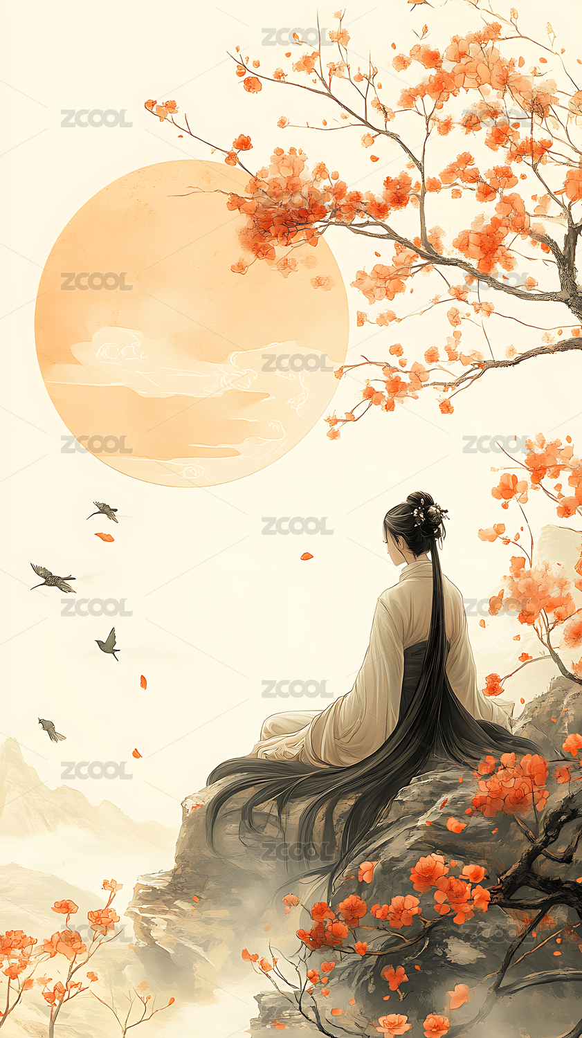 中国风美女山水海报插画