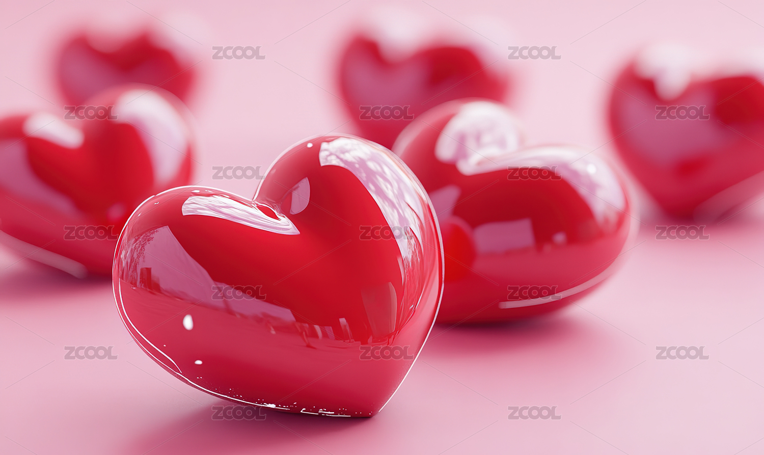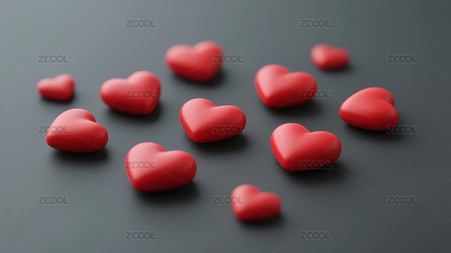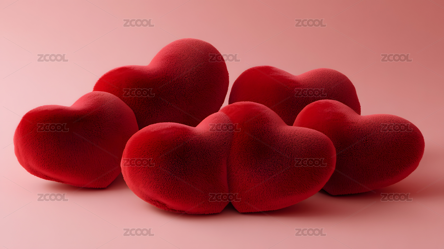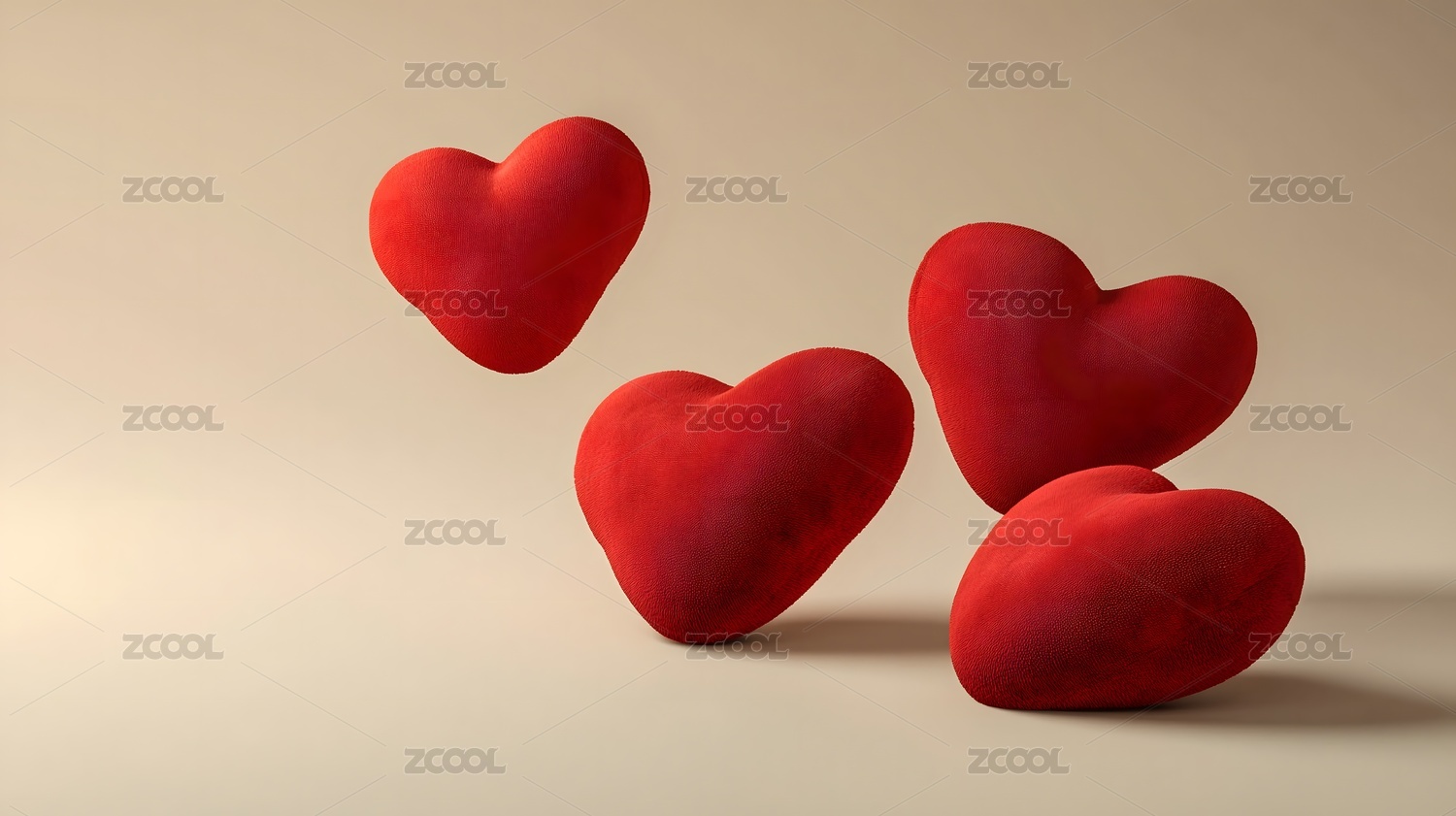 四个红色绒面质感心形漂浮在柔和米色背景上