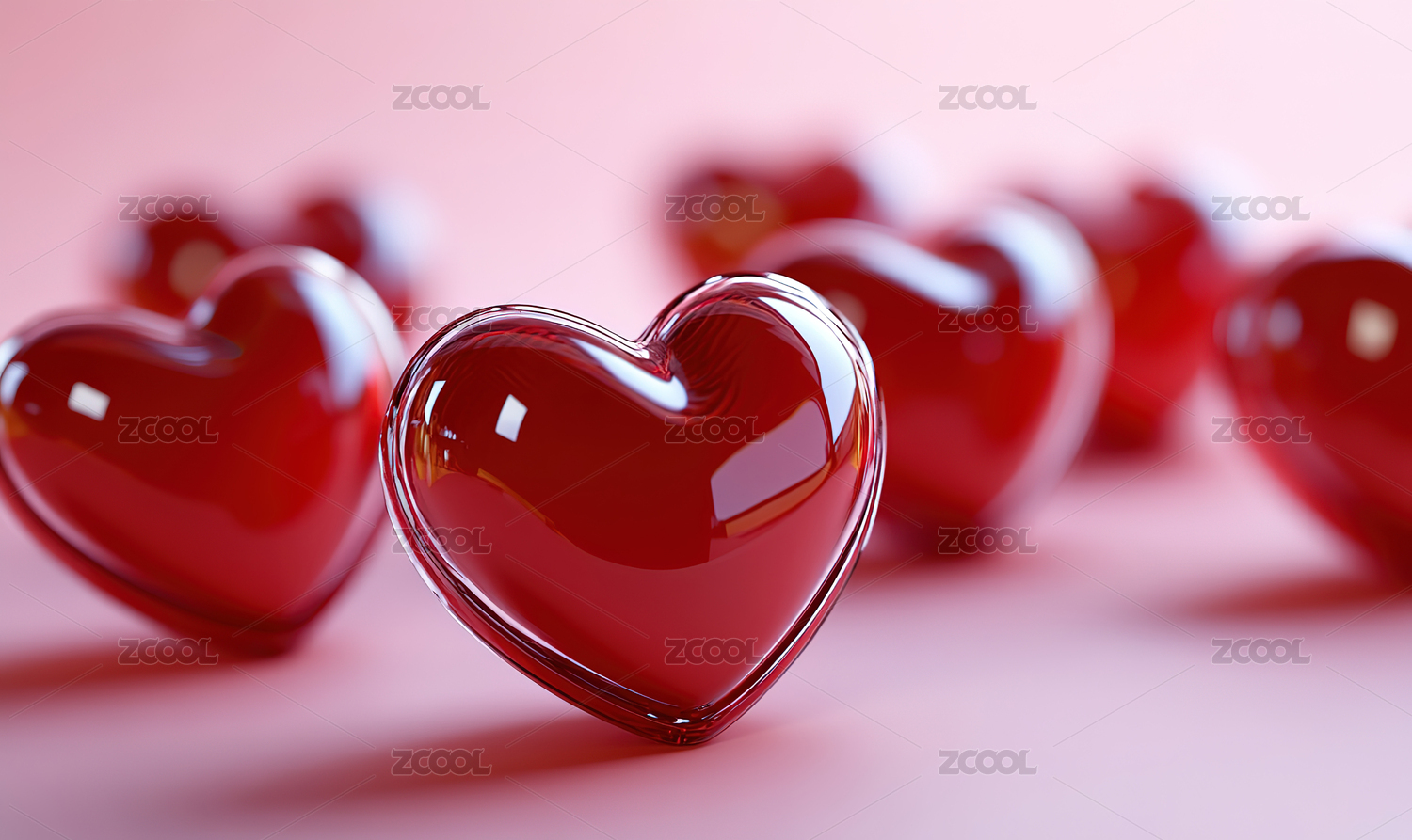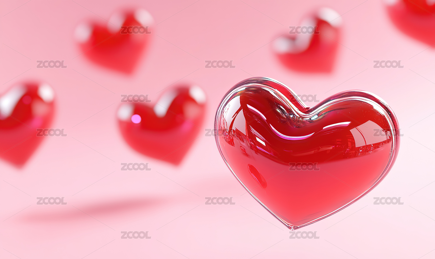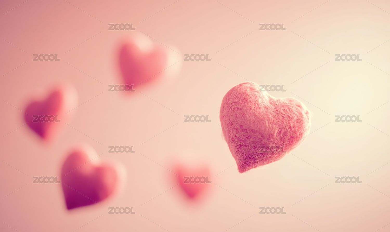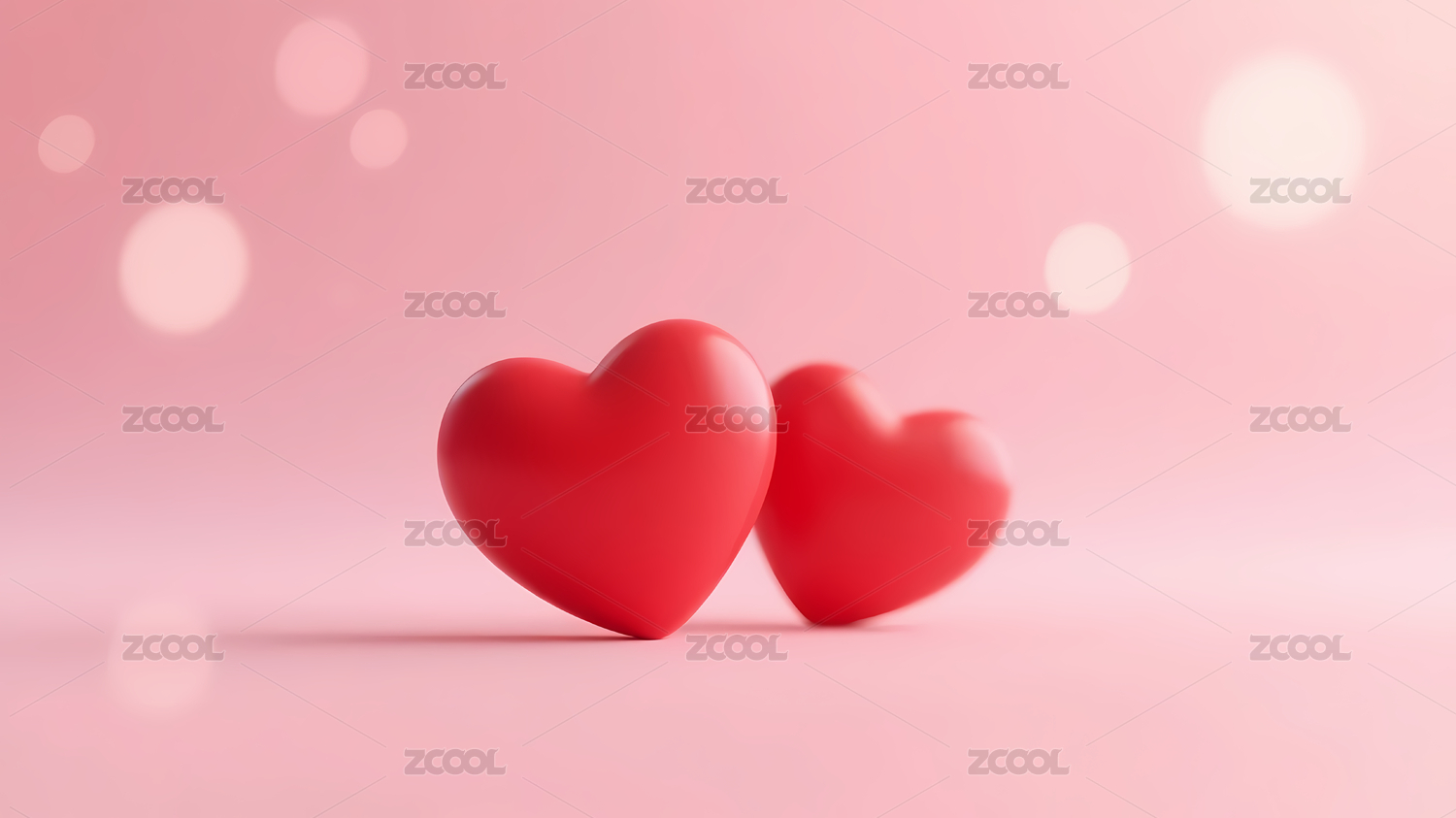 四个红色绒面质感心形漂浮在柔和米色背景上