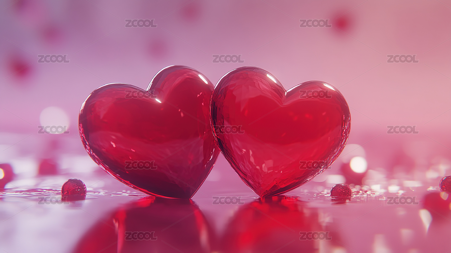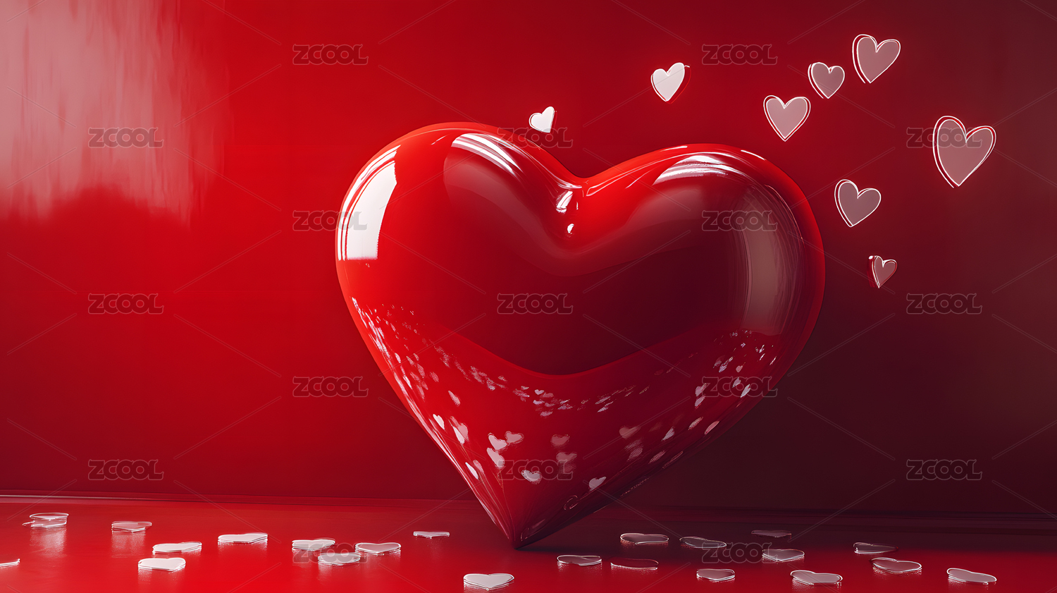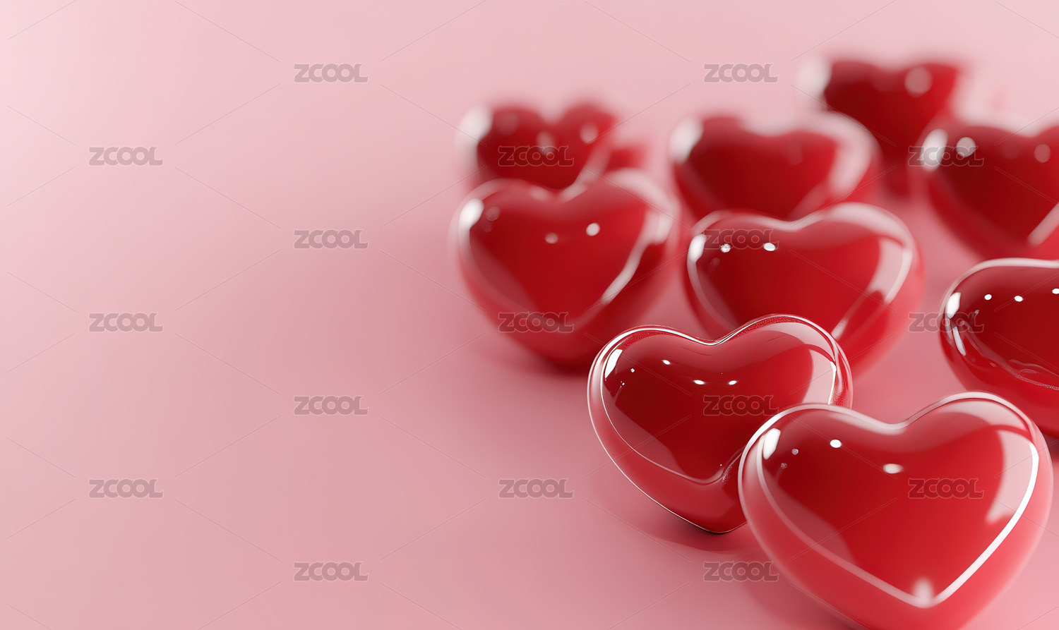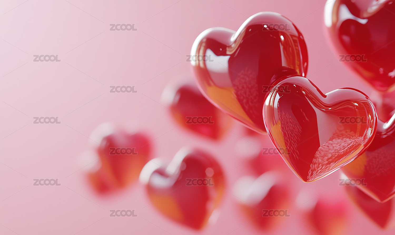 四个红色绒面质感心形漂浮在柔和米色背景上
