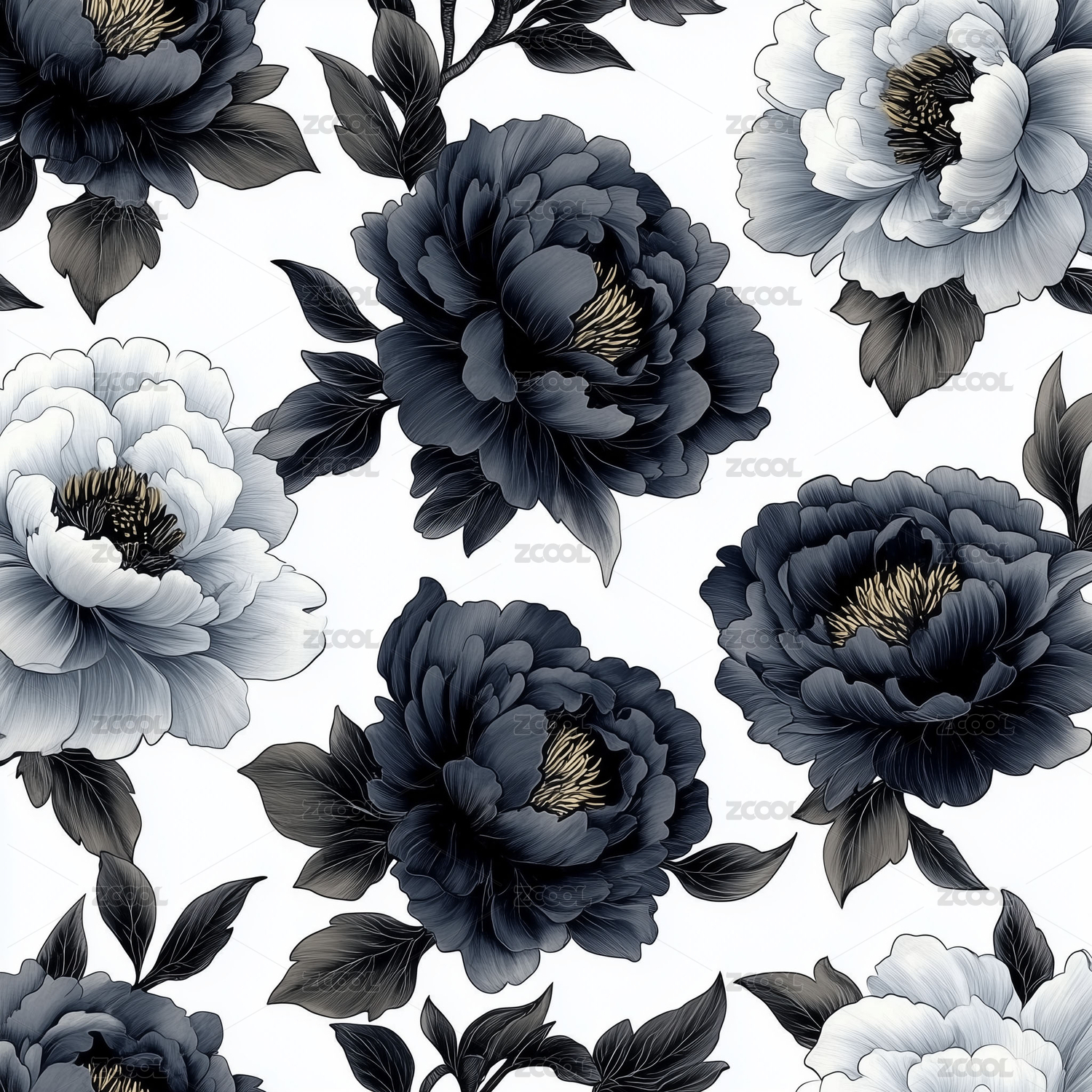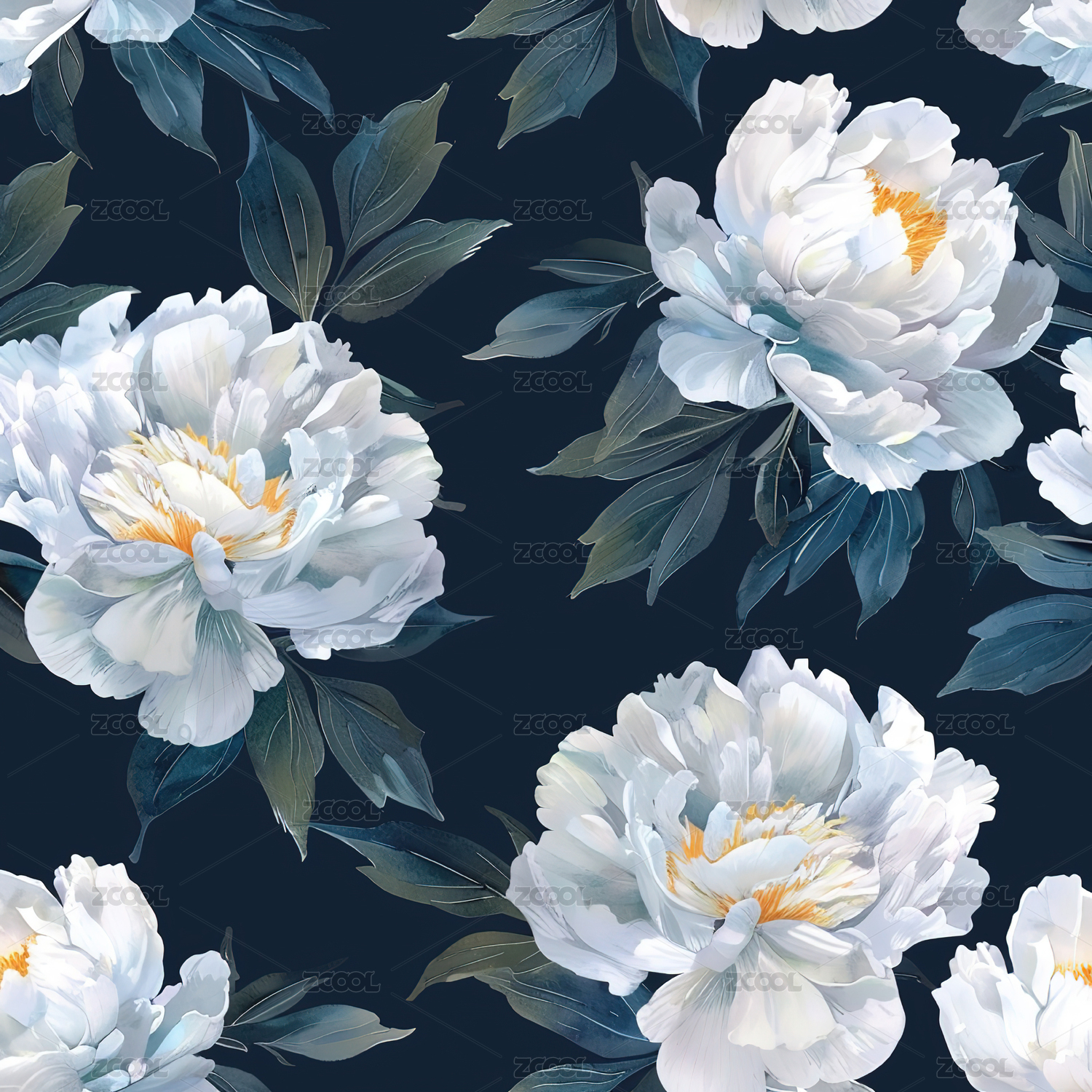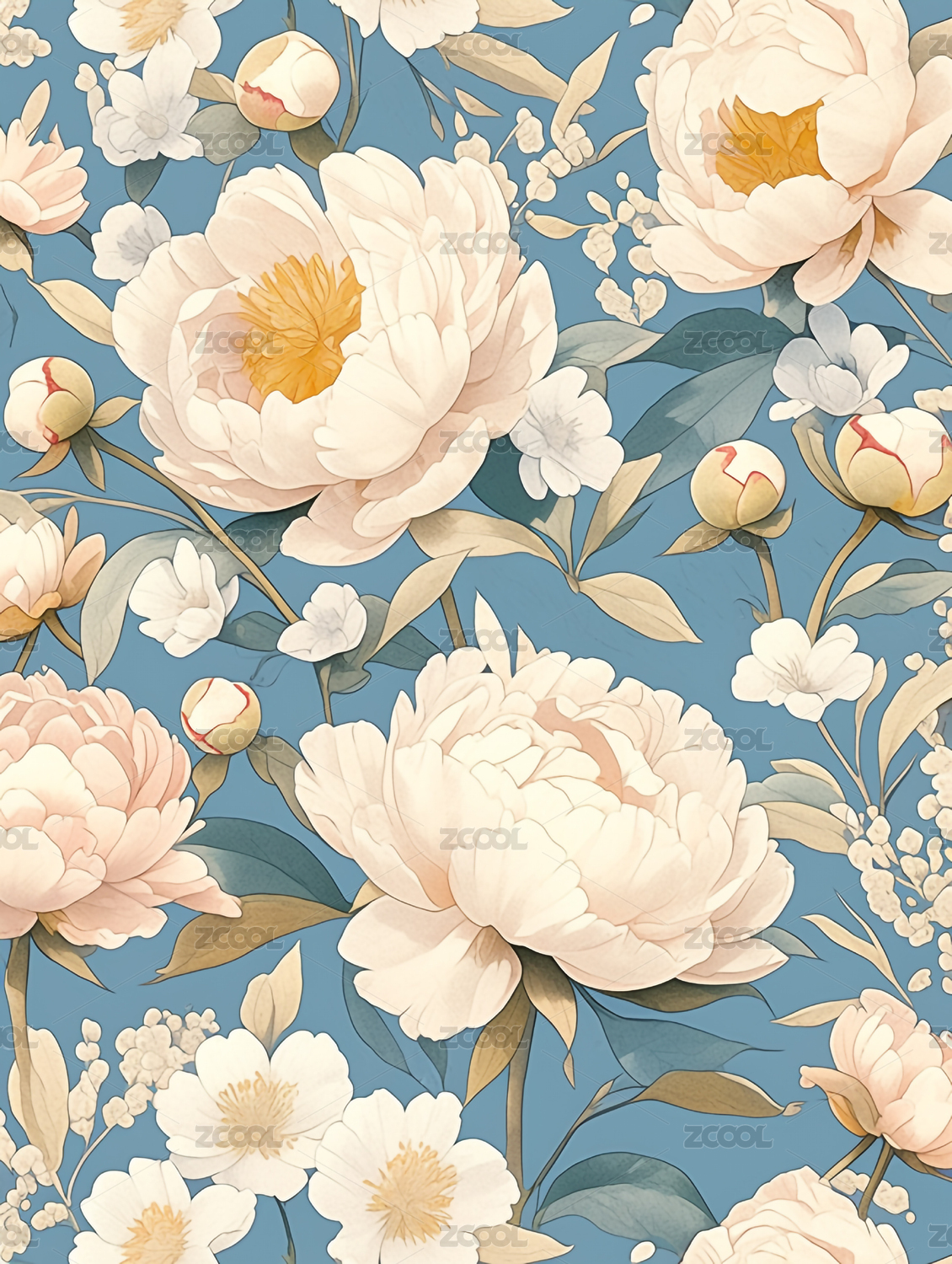 蓝紫色茶花花枝植物水彩无缝图案纹理