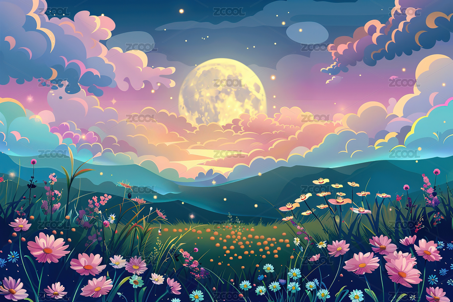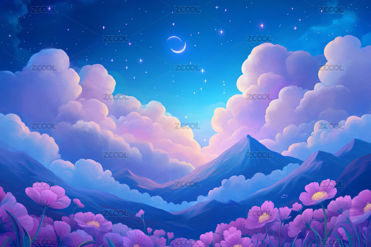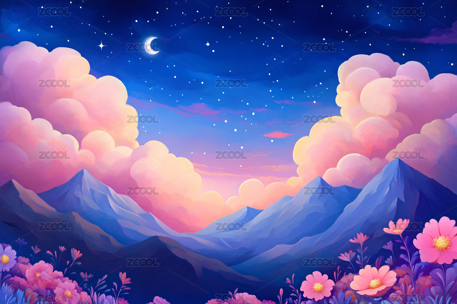 手绘唯美的抽象艺术感夜晚天空风景插画