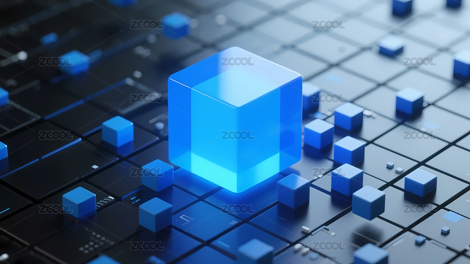 一个发光的蓝色立方体悬浮在黑色立方体上方