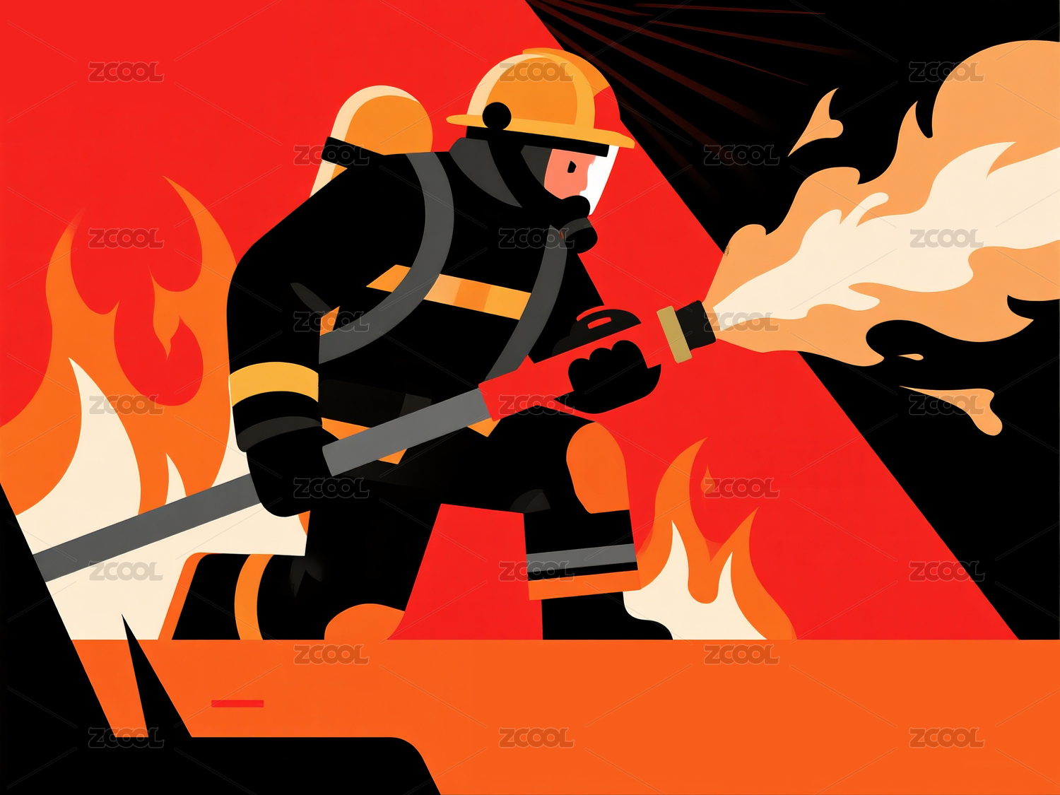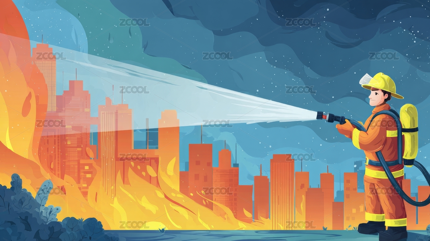 一个拿着高压水枪灭火的消防员插画
