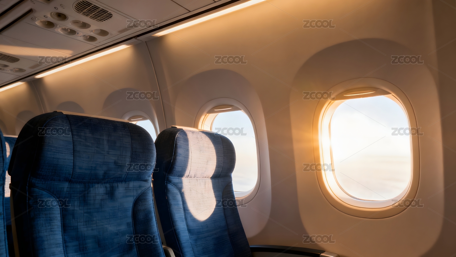 飞机客舱蓝色座椅与舷窗