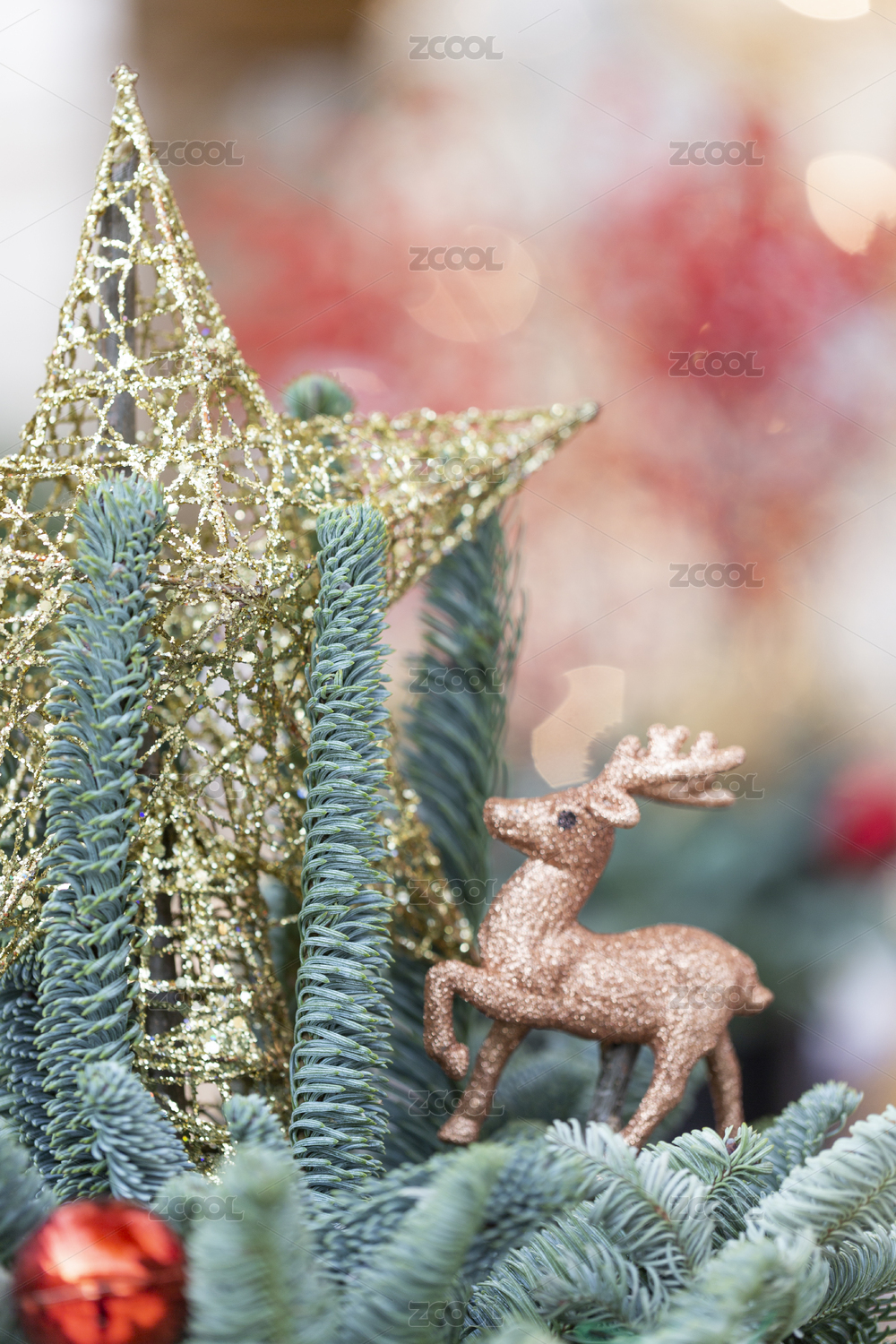 夜晚商业街里圣诞树旁的金色的闪闪发光的麋鹿