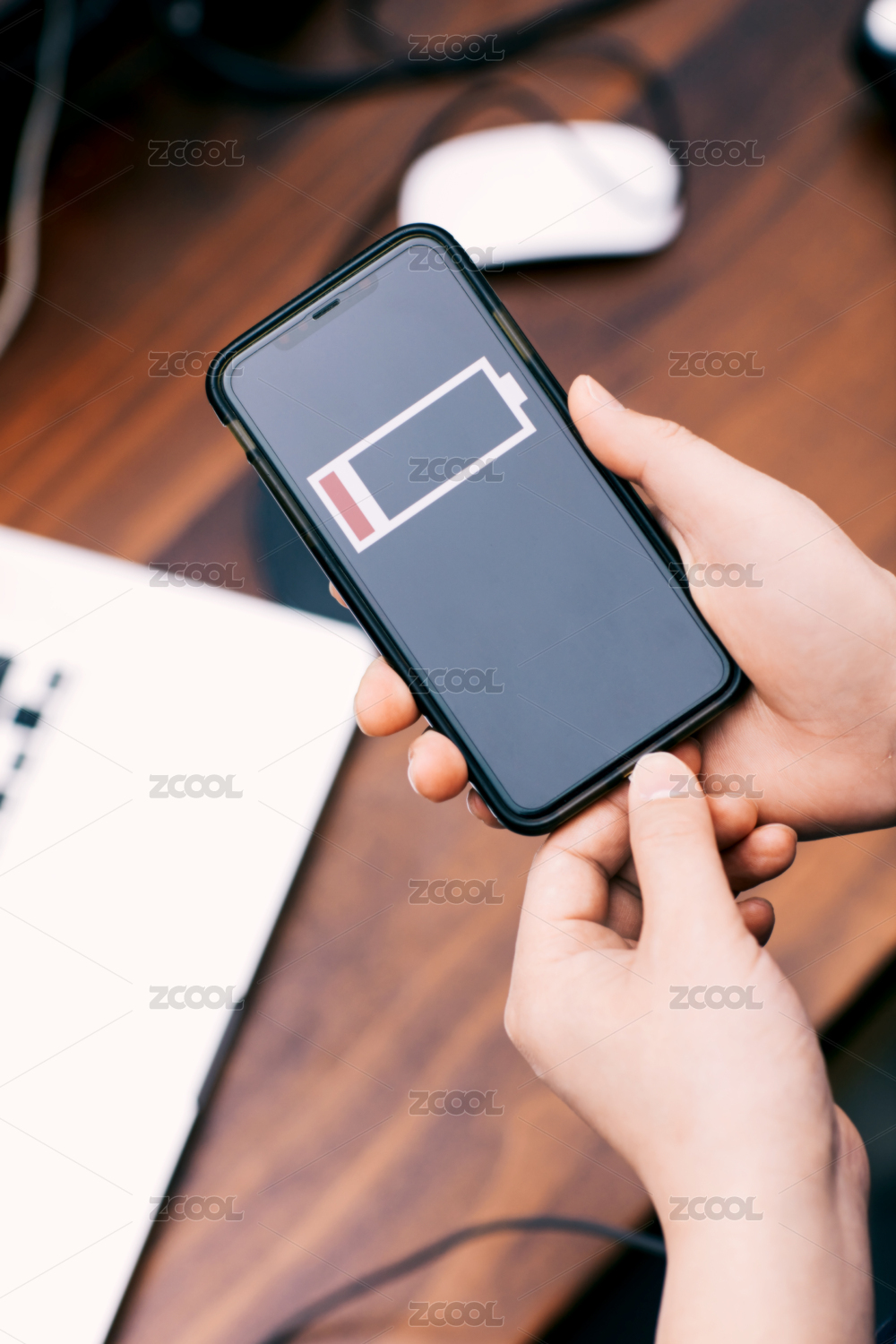 在办公桌上充电的手机和电脑鼠标