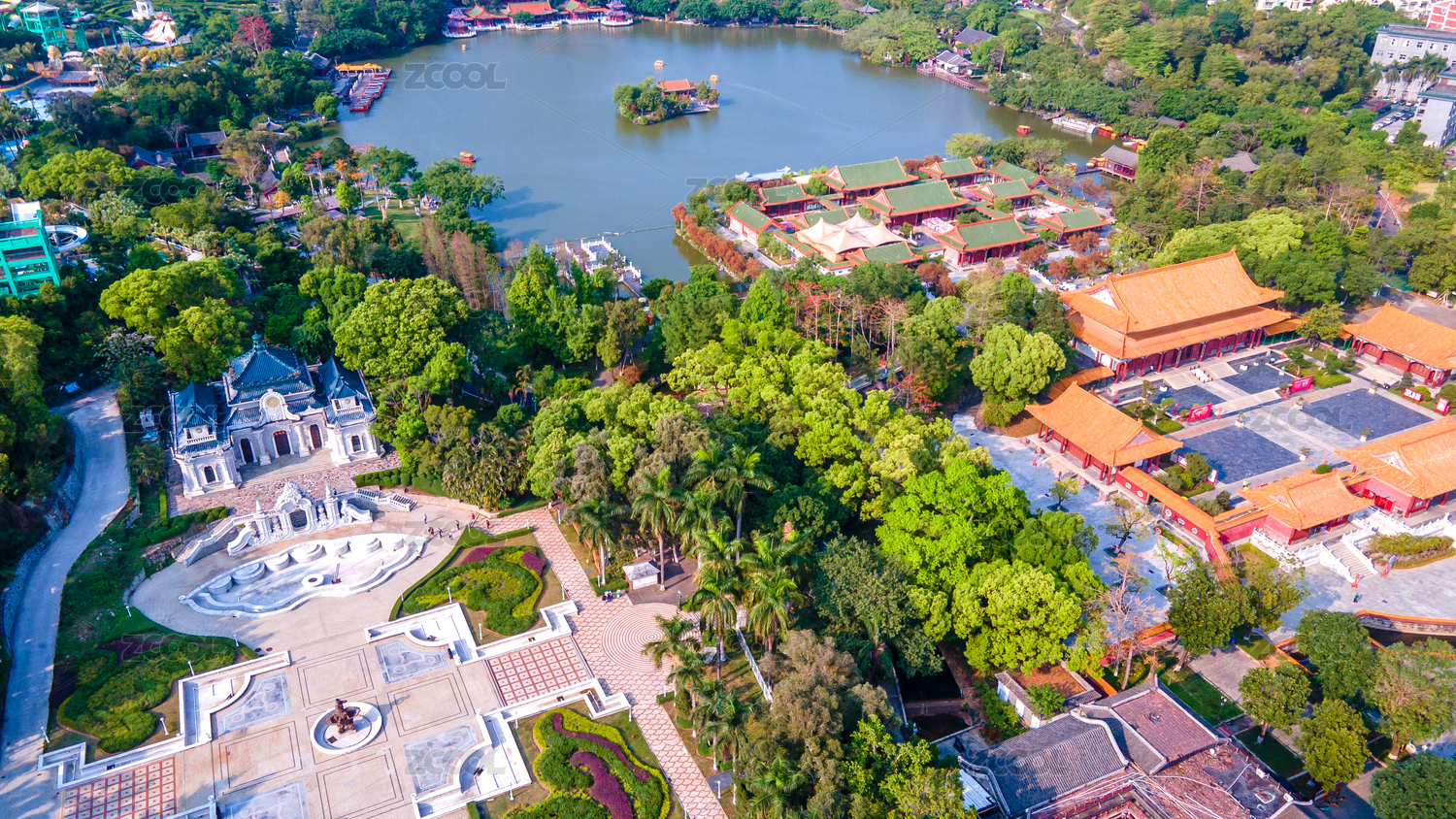 航拍广州海珠湖畔的岭南文化馆